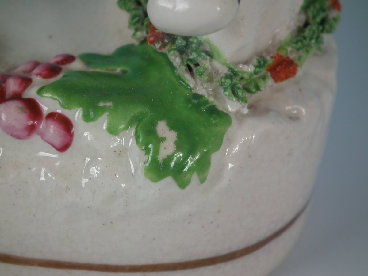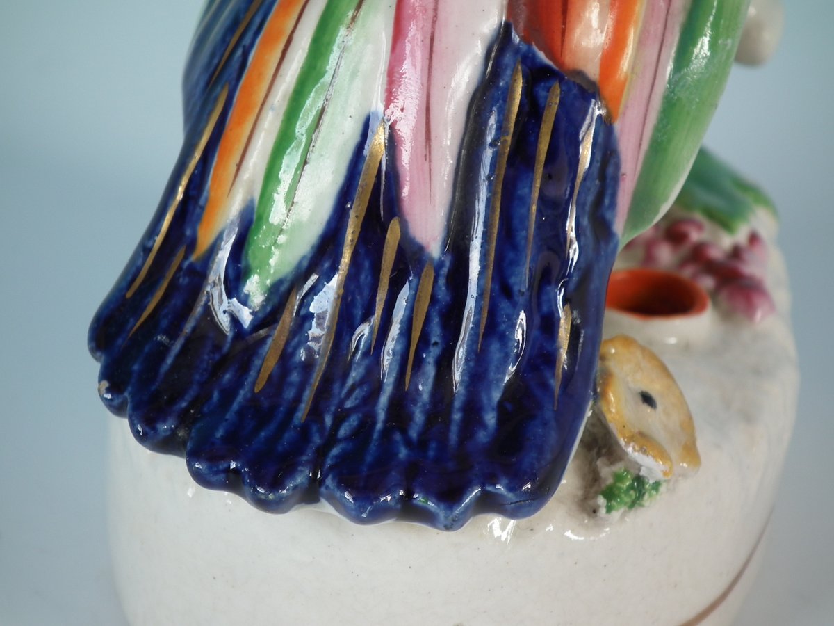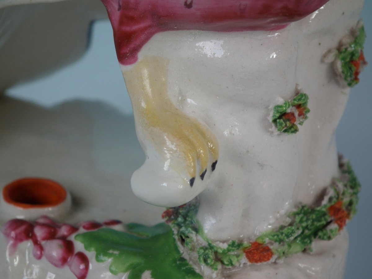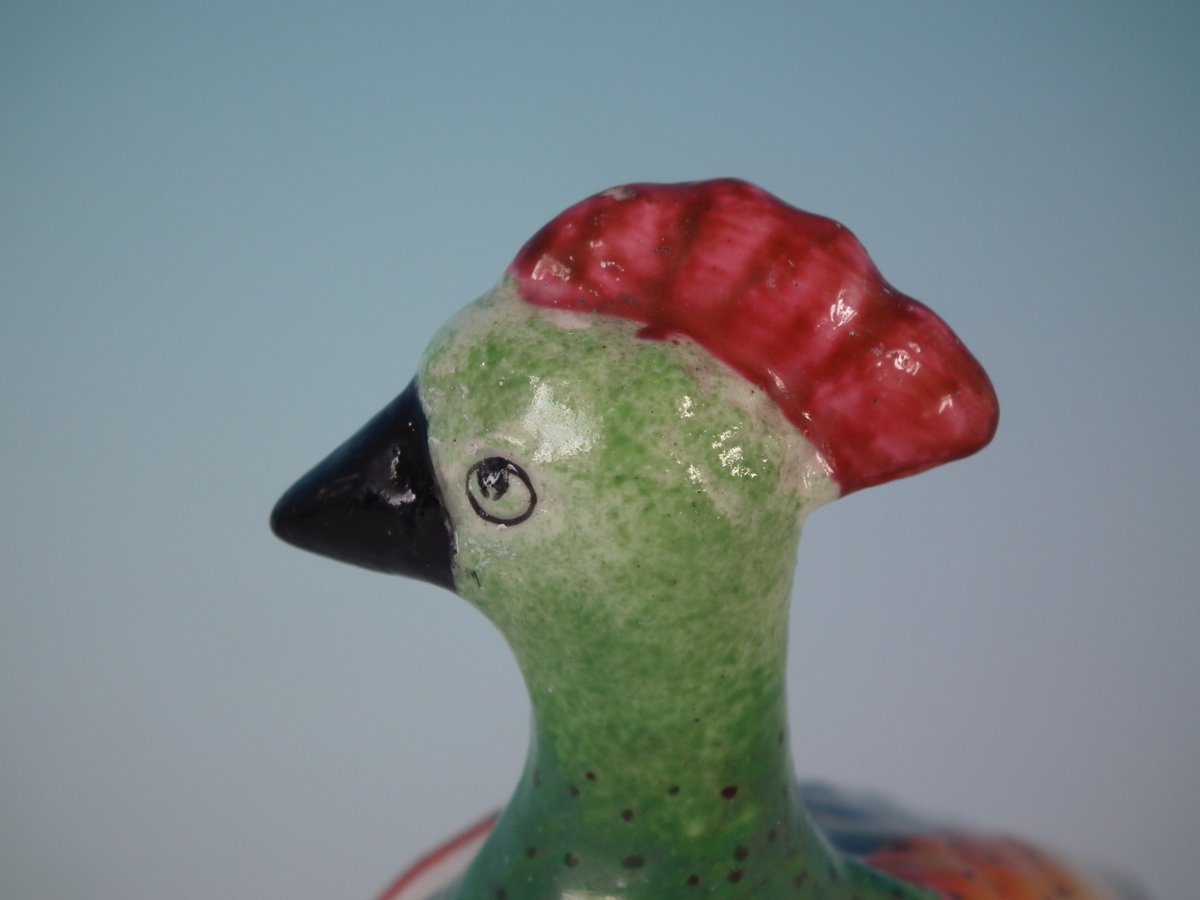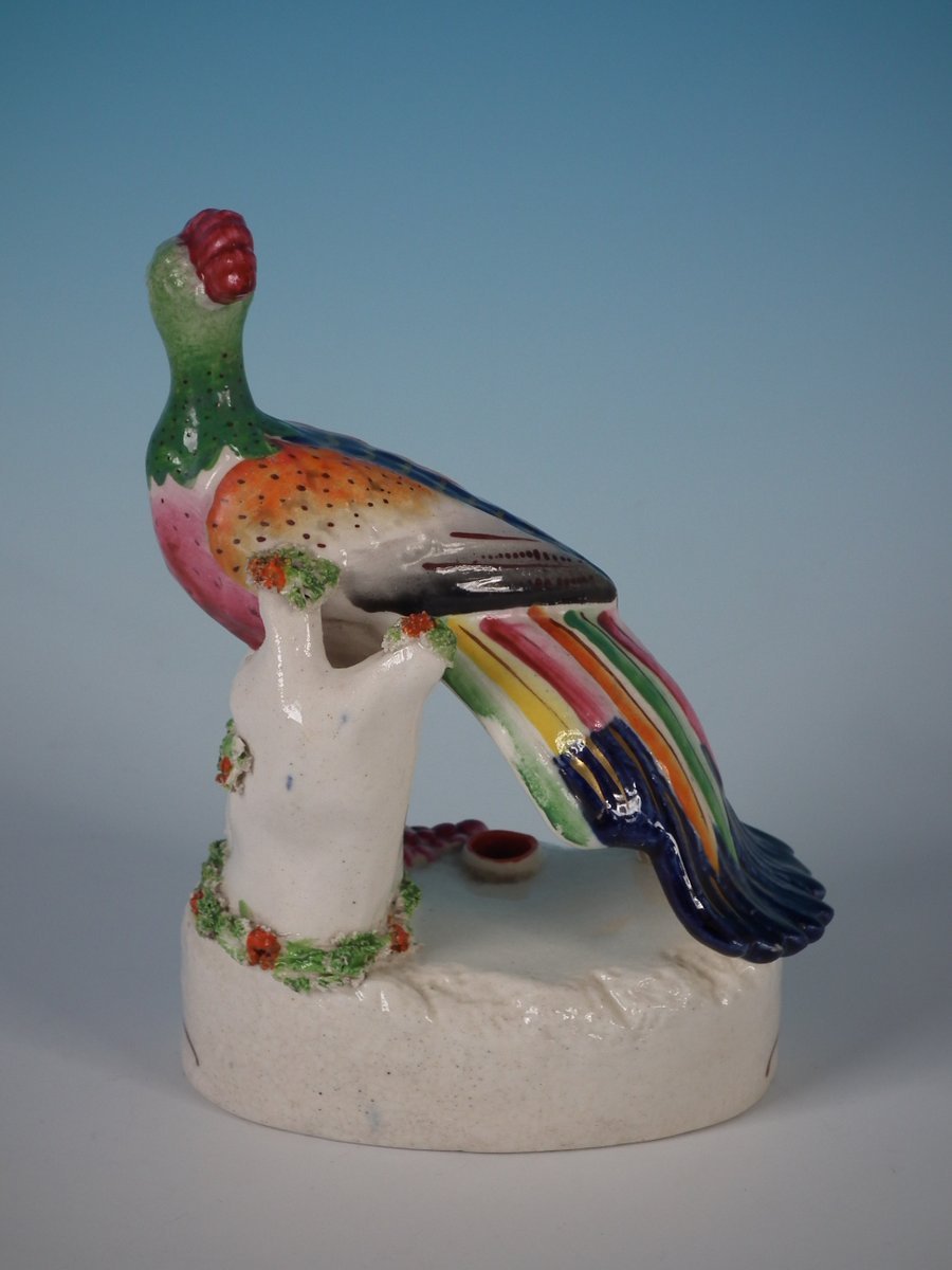 Victorian, circa 1860. 5.8ins high, 4.7ins wide, 2.8ins depth. Staffordshire Pottery quill holder which features a colourful bird, perched on a shaped base.