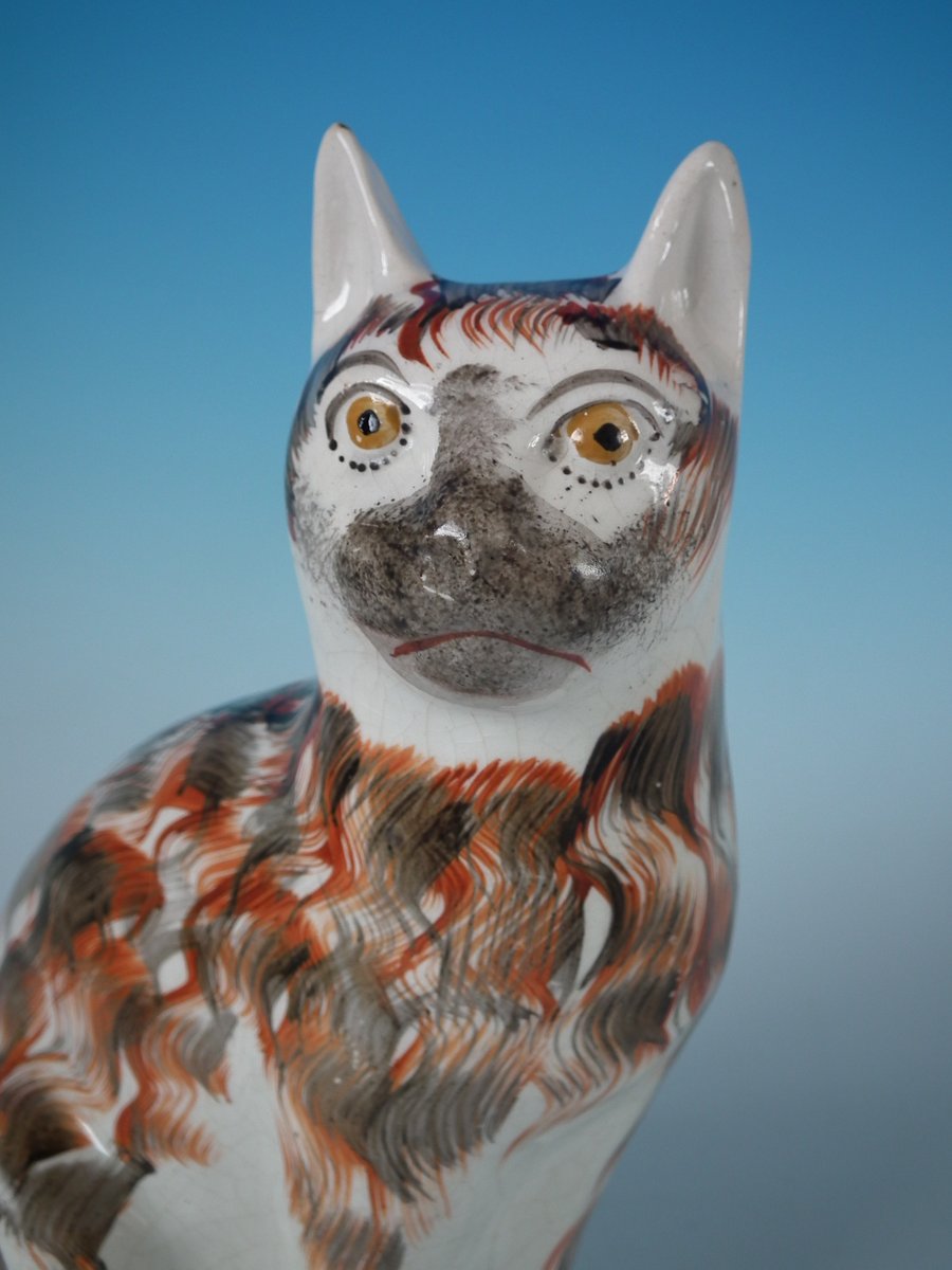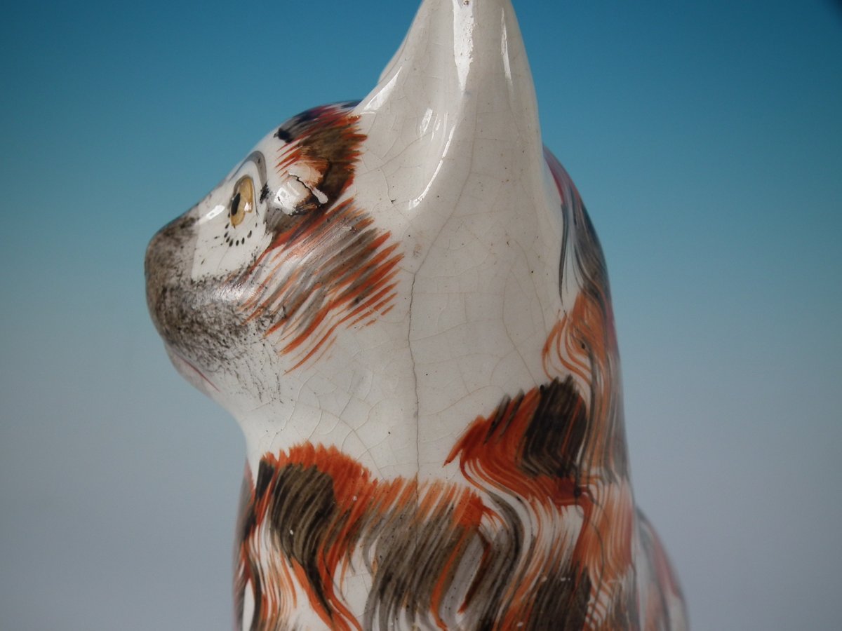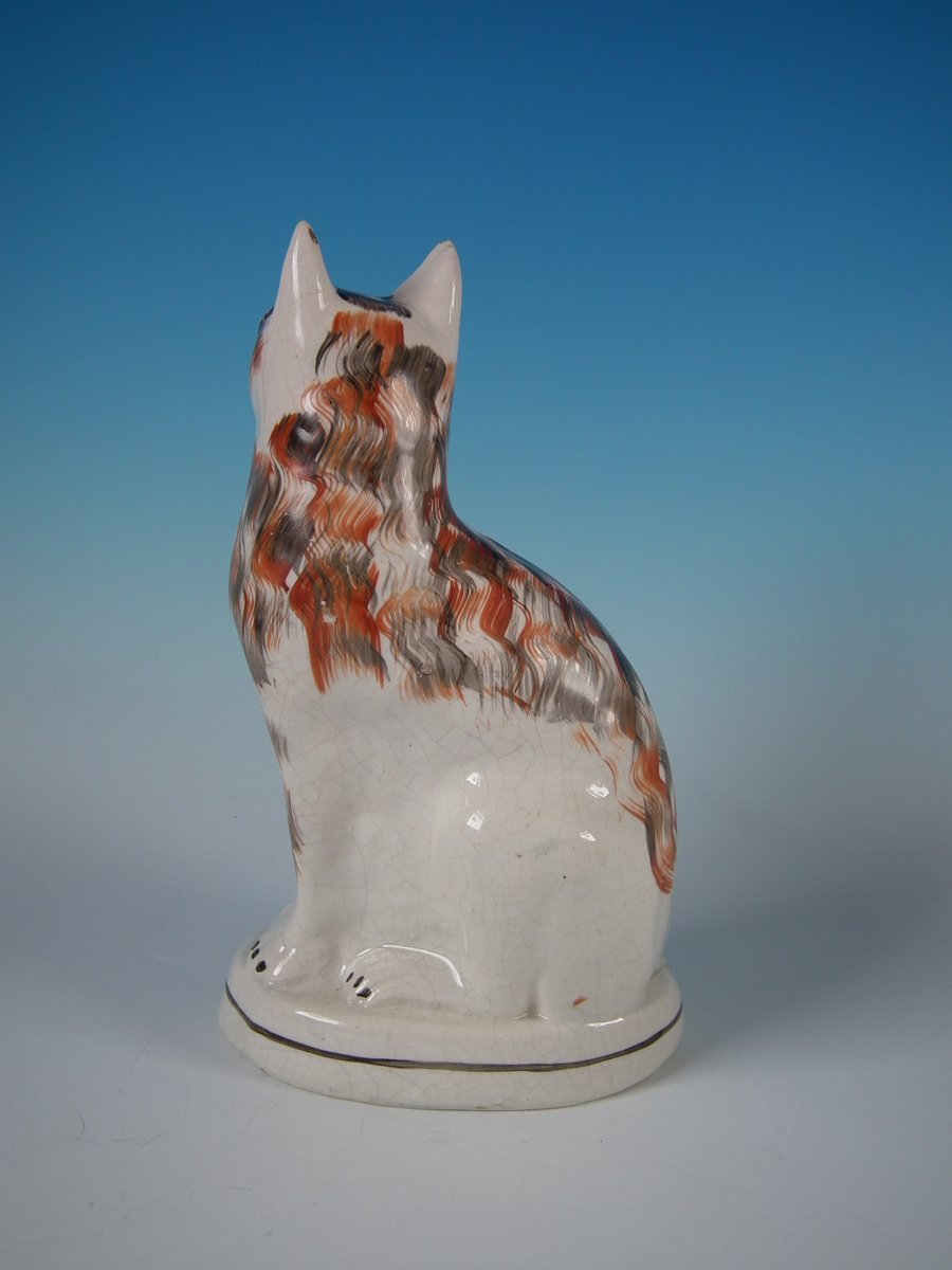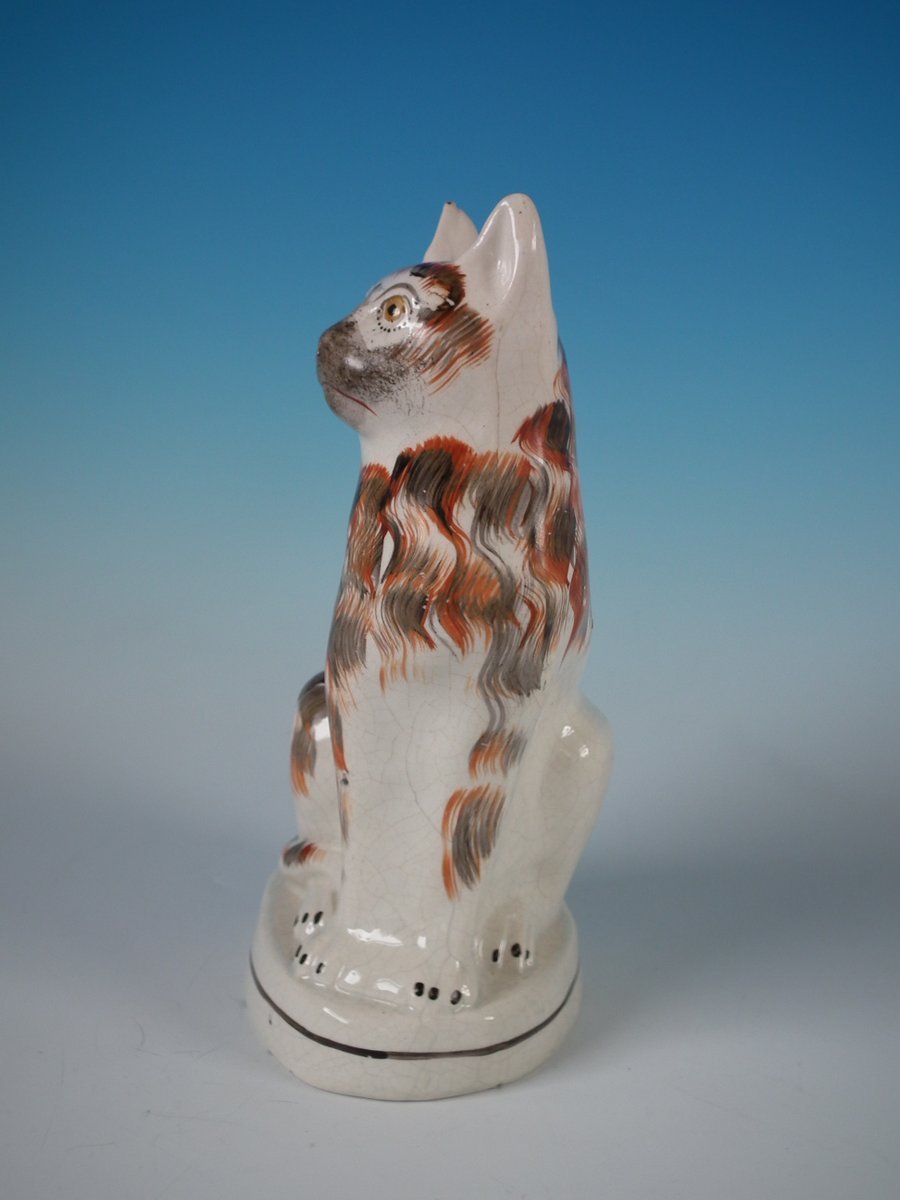Victorian, circa 1860. 10.6ins high, 6.3ins wide, 4.7ins depth. Staffordshire Pottery figure which features a cat, seated on an oval base.
