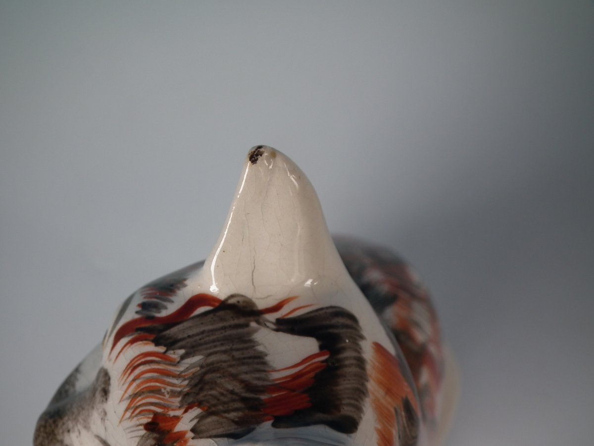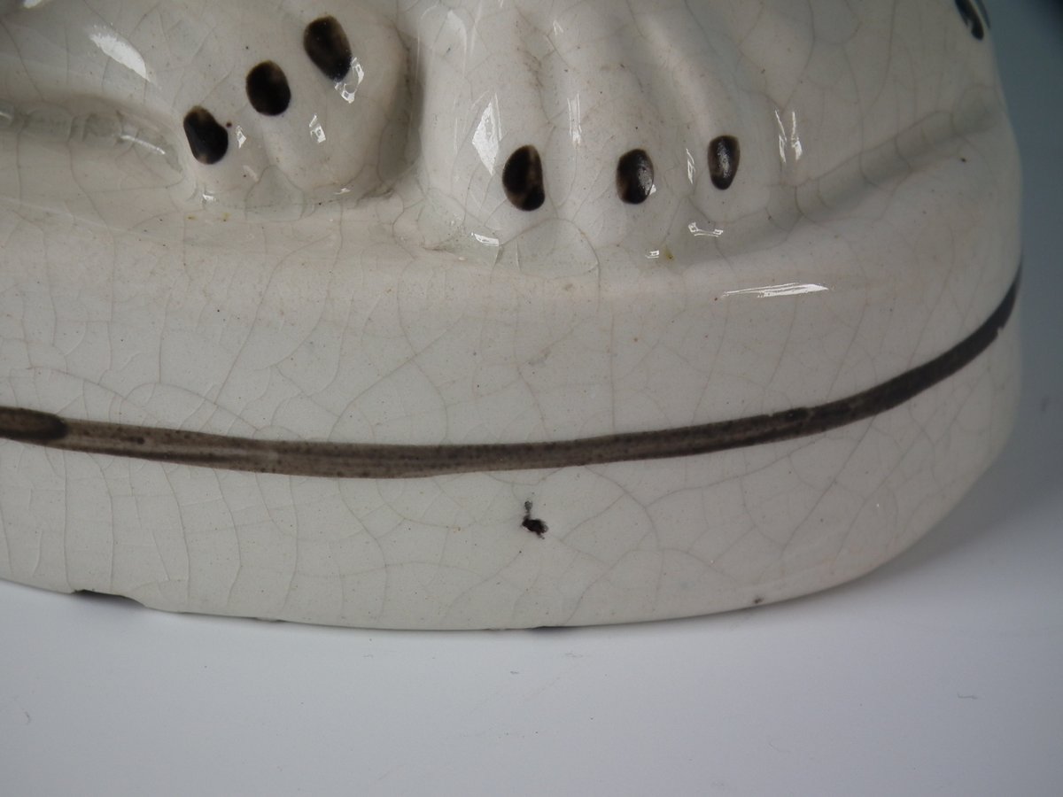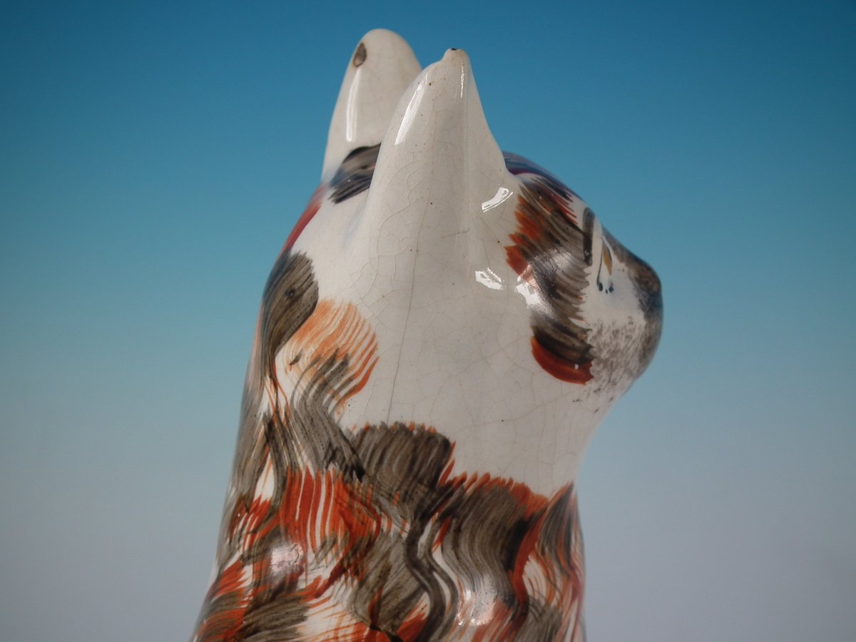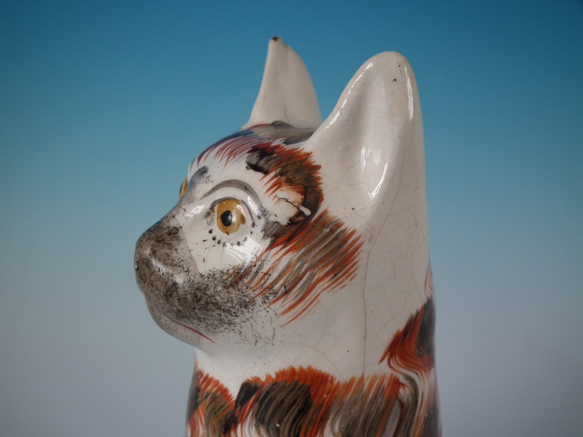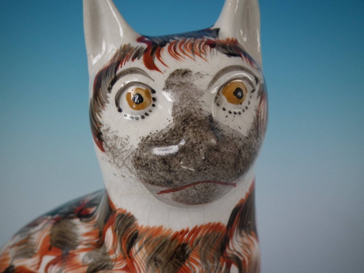 Victorian, circa 1860. 10.6ins high, 6.3ins wide, 4.7ins depth. Staffordshire Pottery figure which features a cat, seated on an oval base.