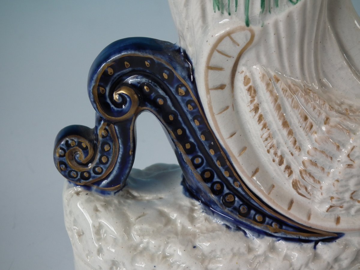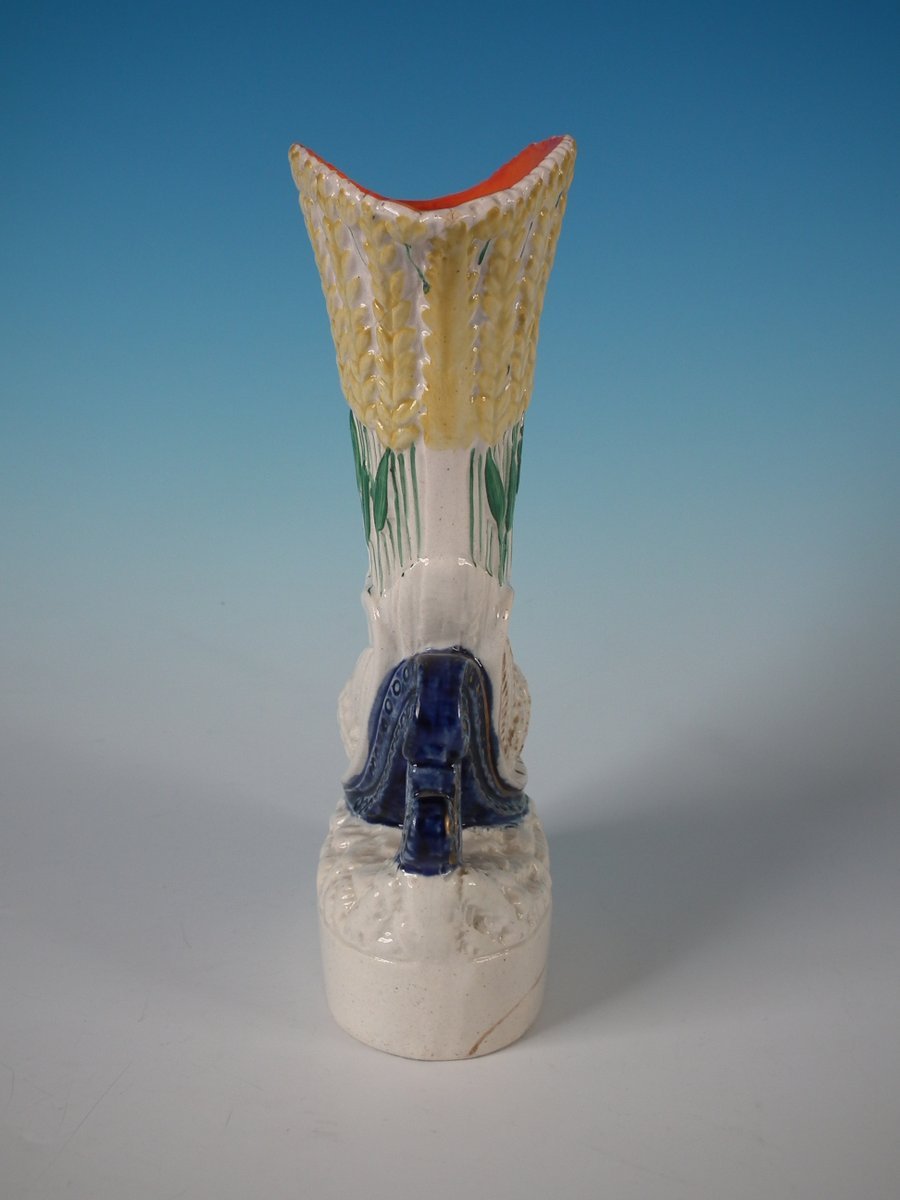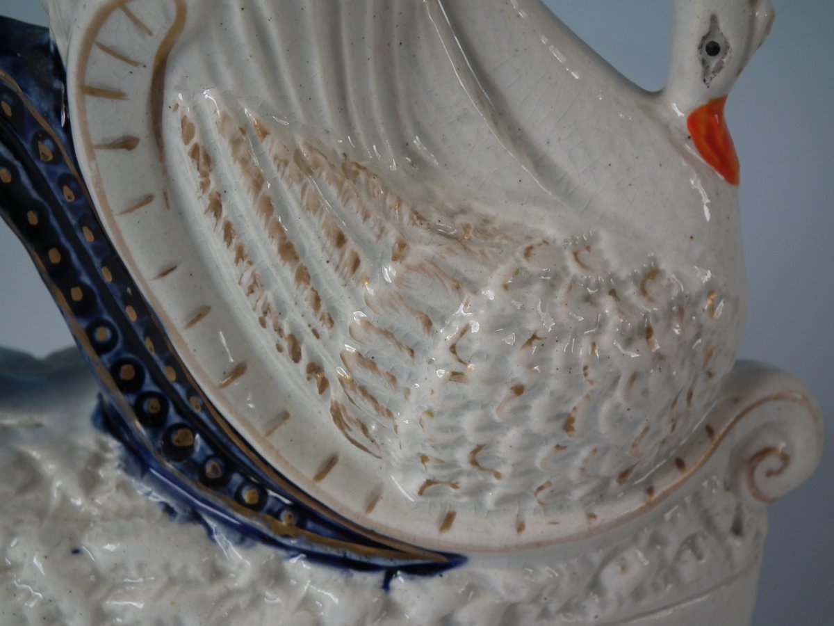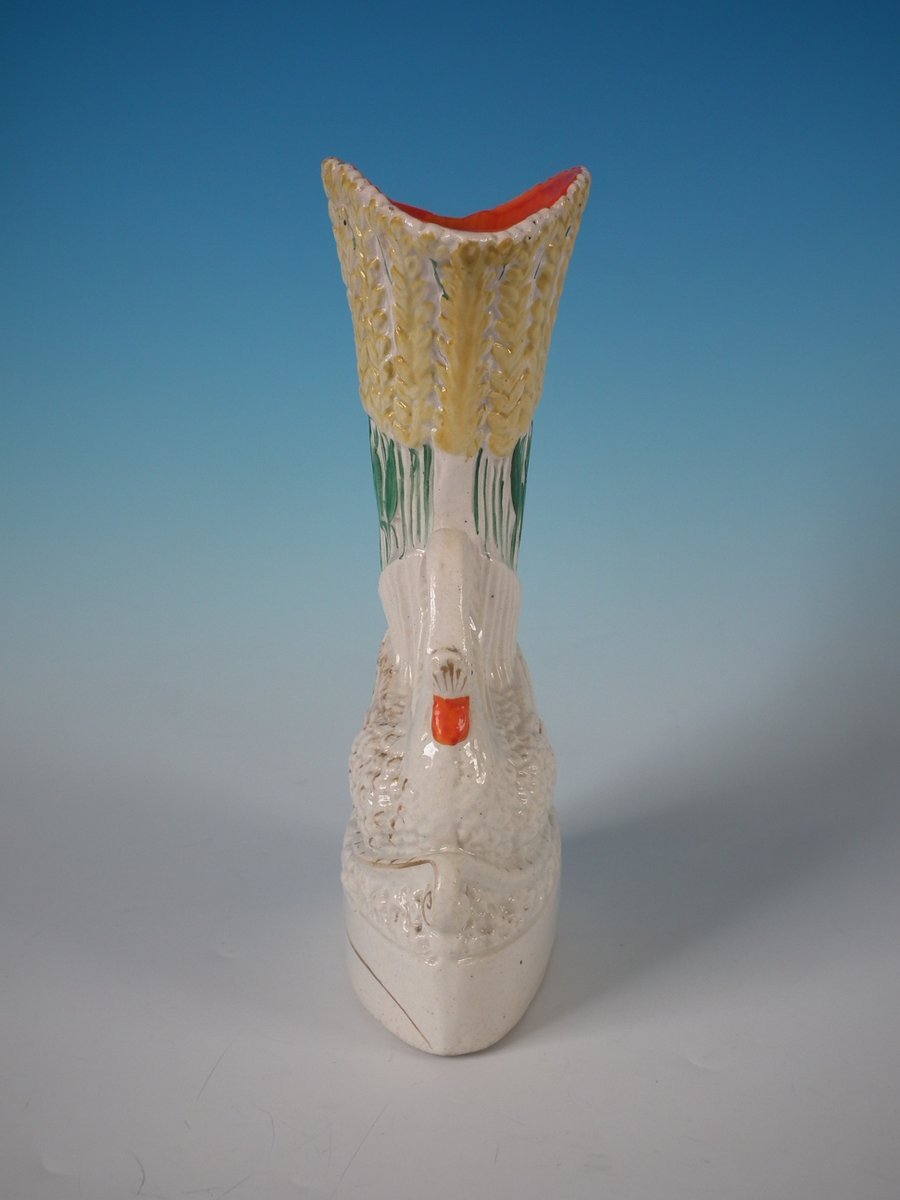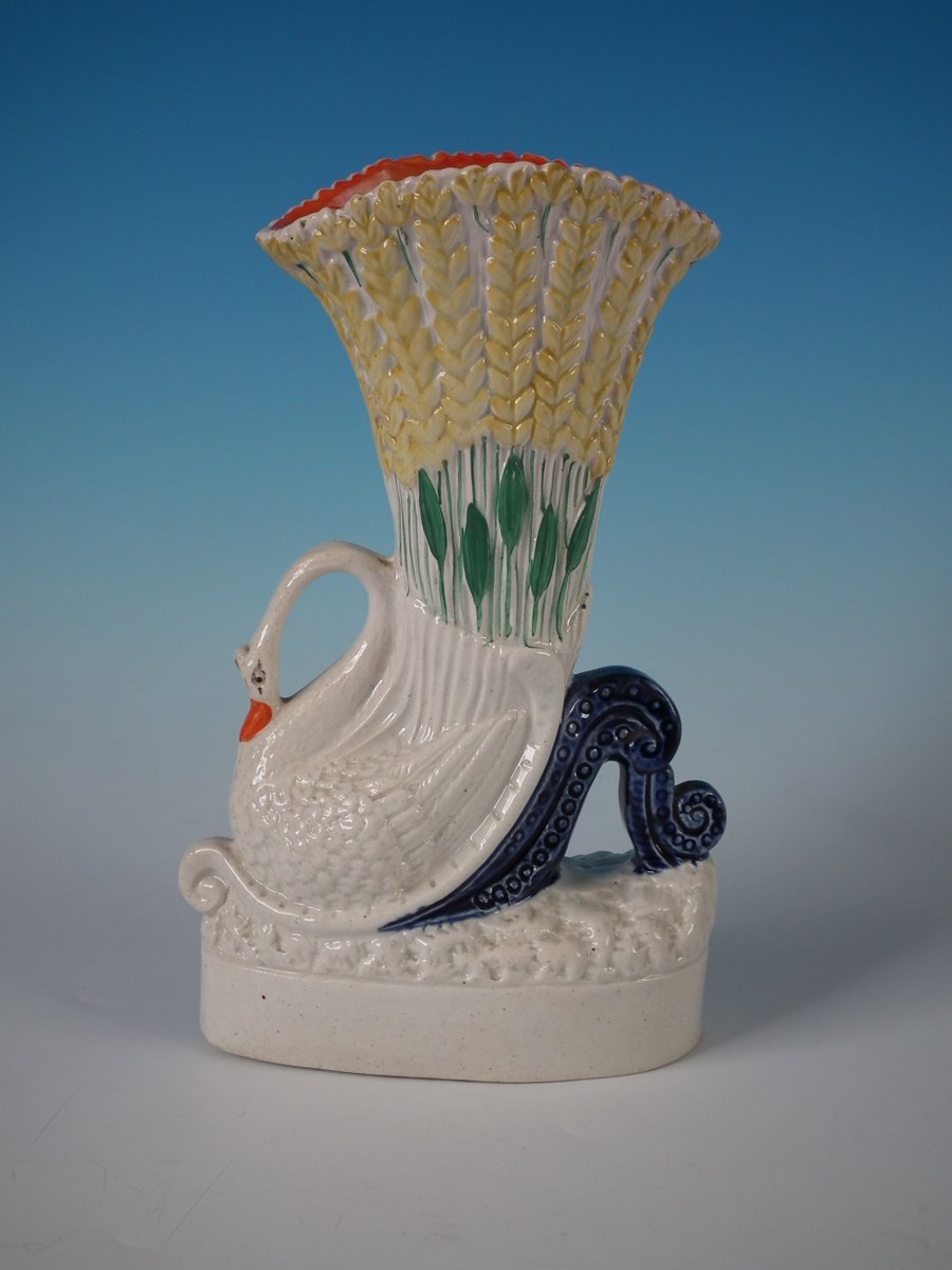 Victorian, circa 1860. 9.1ins high, 5.7ins wide, 2.6ins depth. Staffordshire Pottery spill vase which features a swan with corn decoration to the spill,