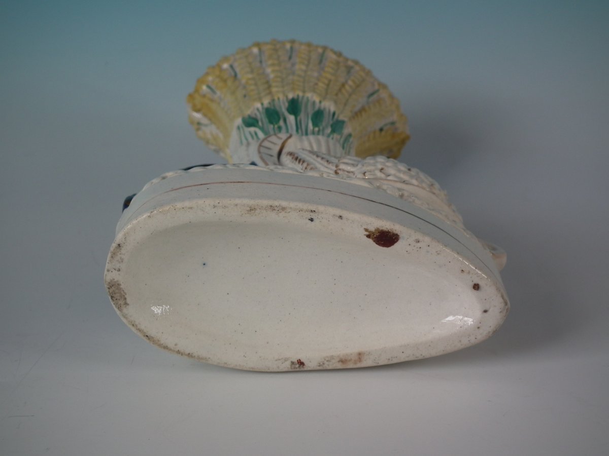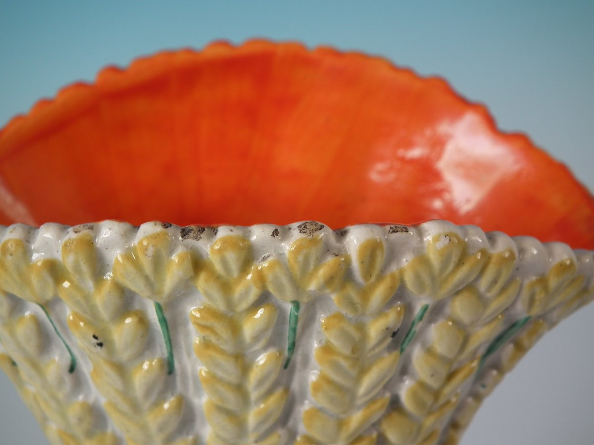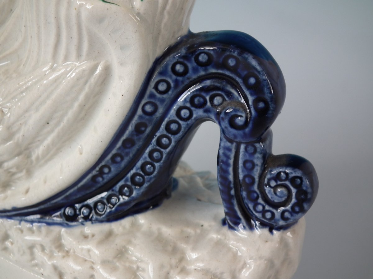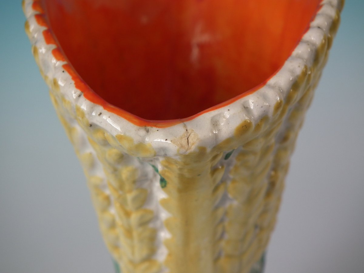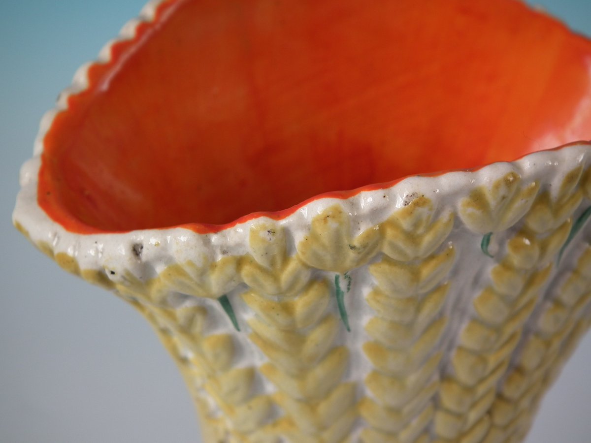 Victorian, circa 1860. 9.1ins high, 5.7ins wide, 2.6ins depth. Staffordshire Pottery spill vase which features a swan with corn decoration to the spill,