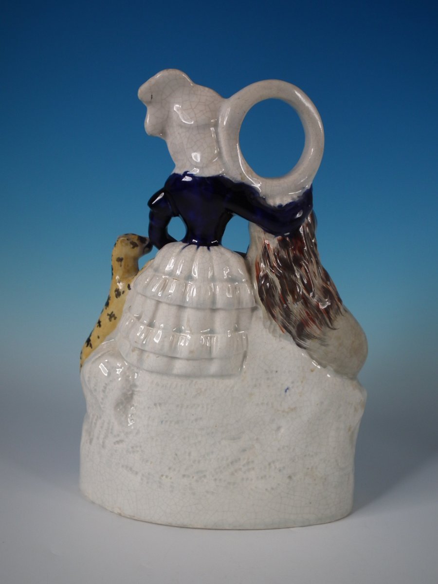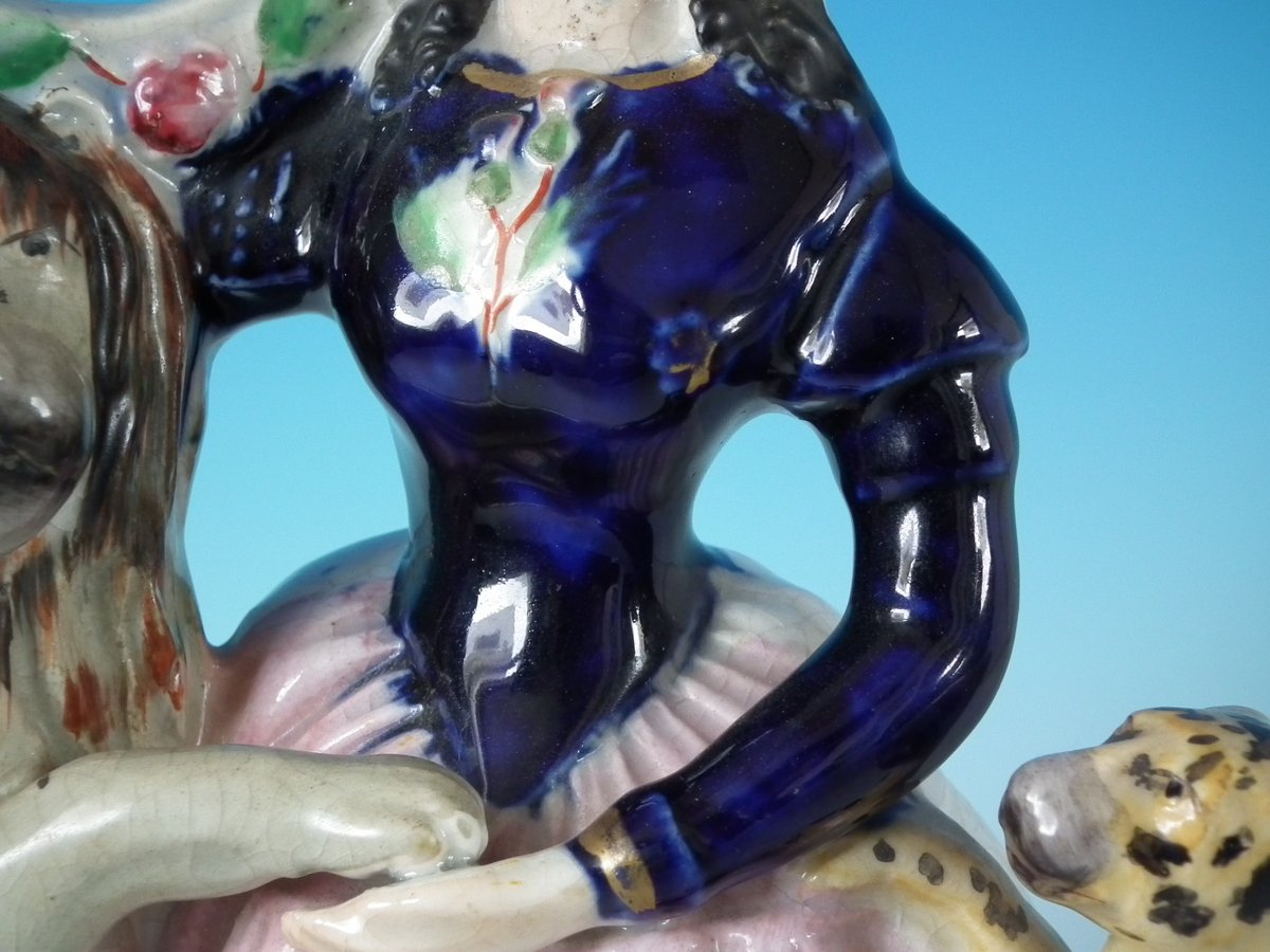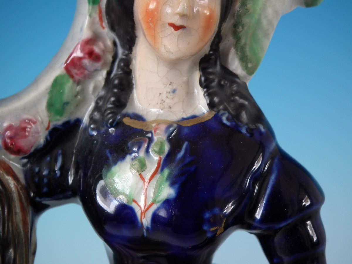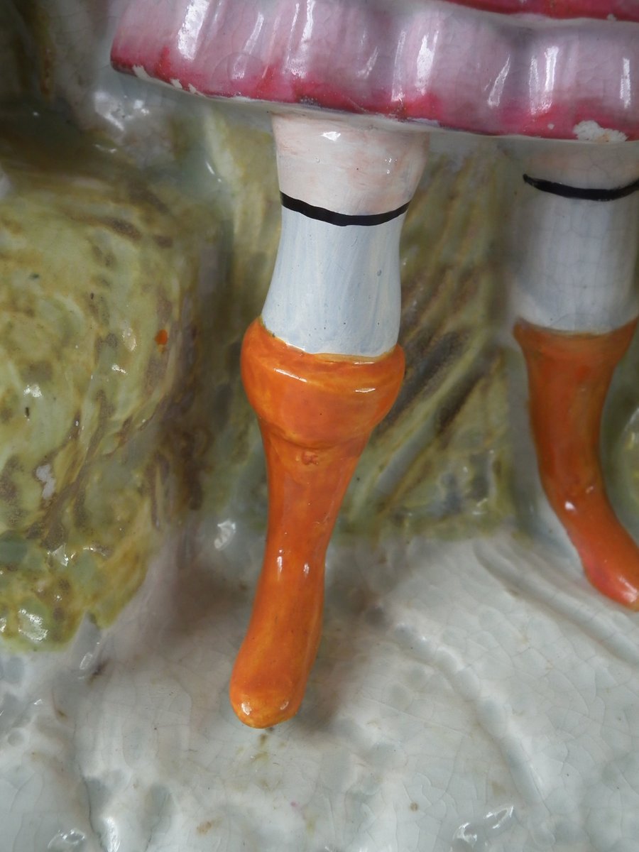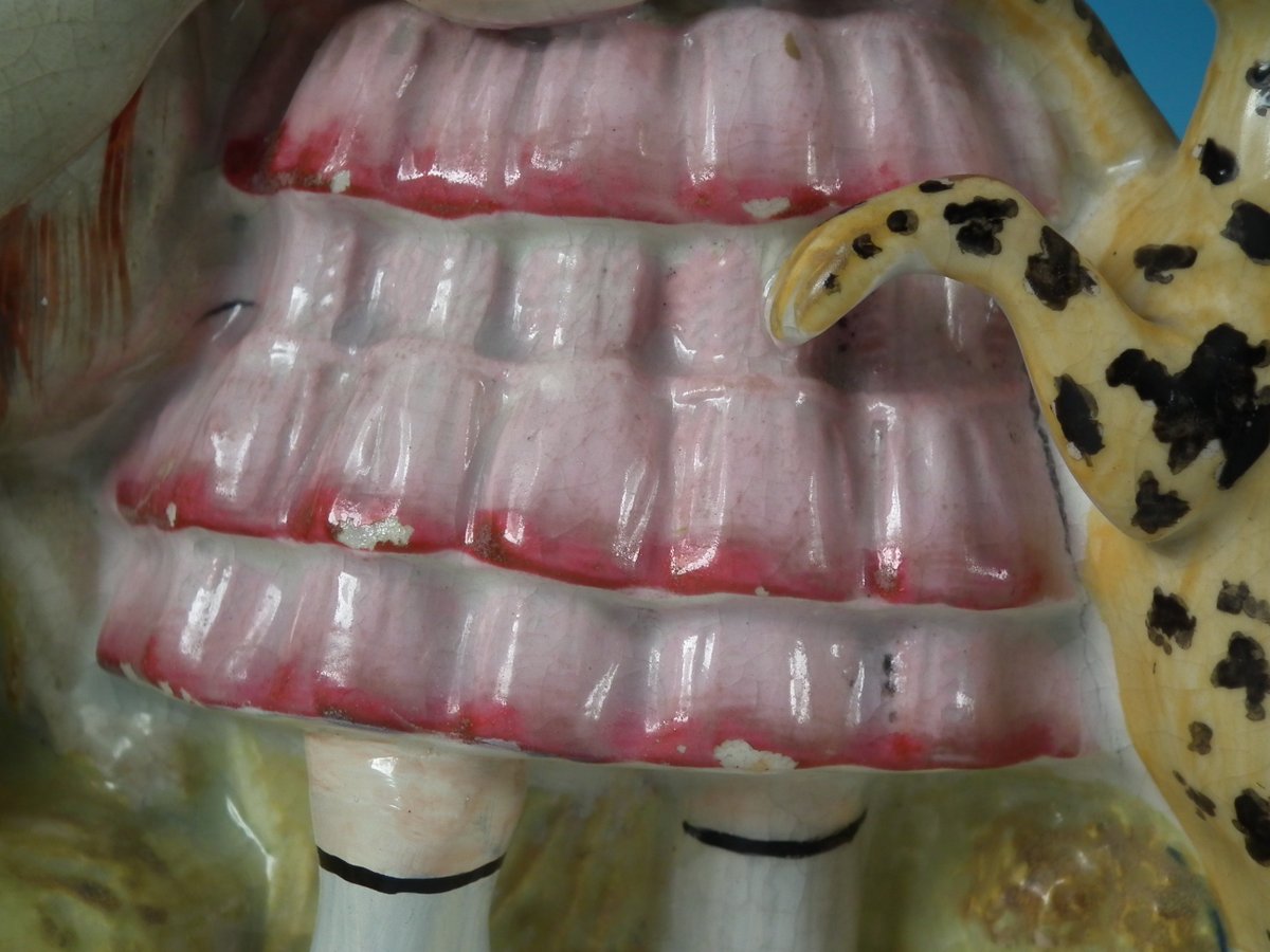 Victorian, circa 1860. 12.2ins high, 8.7ins wide, 4.3ins depth. Staffordshire Pottery figure with a folklore theme which features Ellen Blight with a lion and leopard,