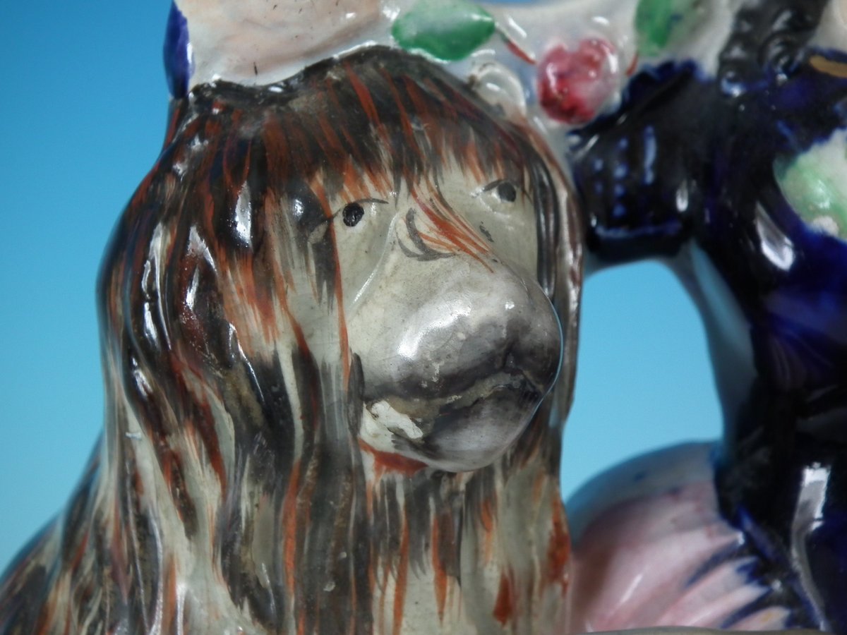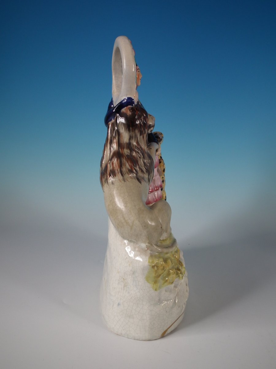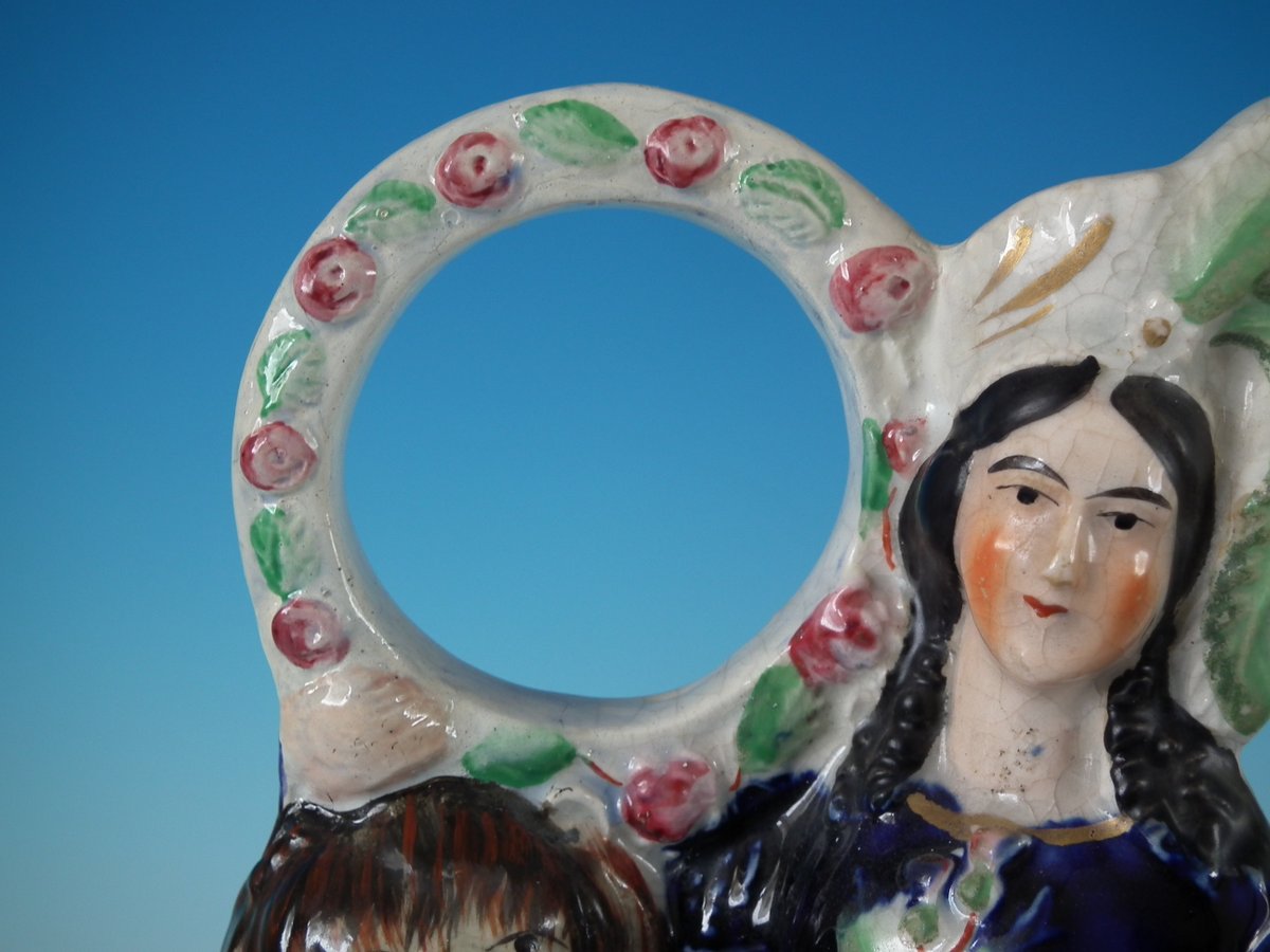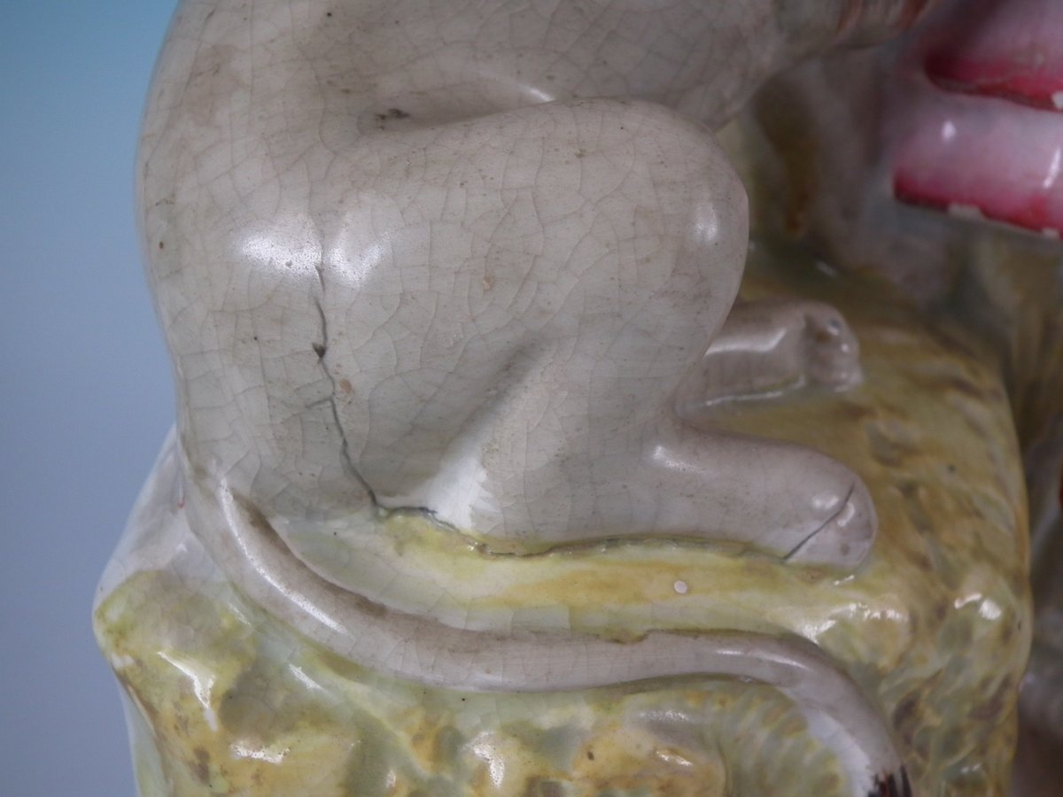 Victorian, circa 1860. 12.2ins high, 8.7ins wide, 4.3ins depth. Staffordshire Pottery figure with a folklore theme which features Ellen Blight with a lion and leopard,