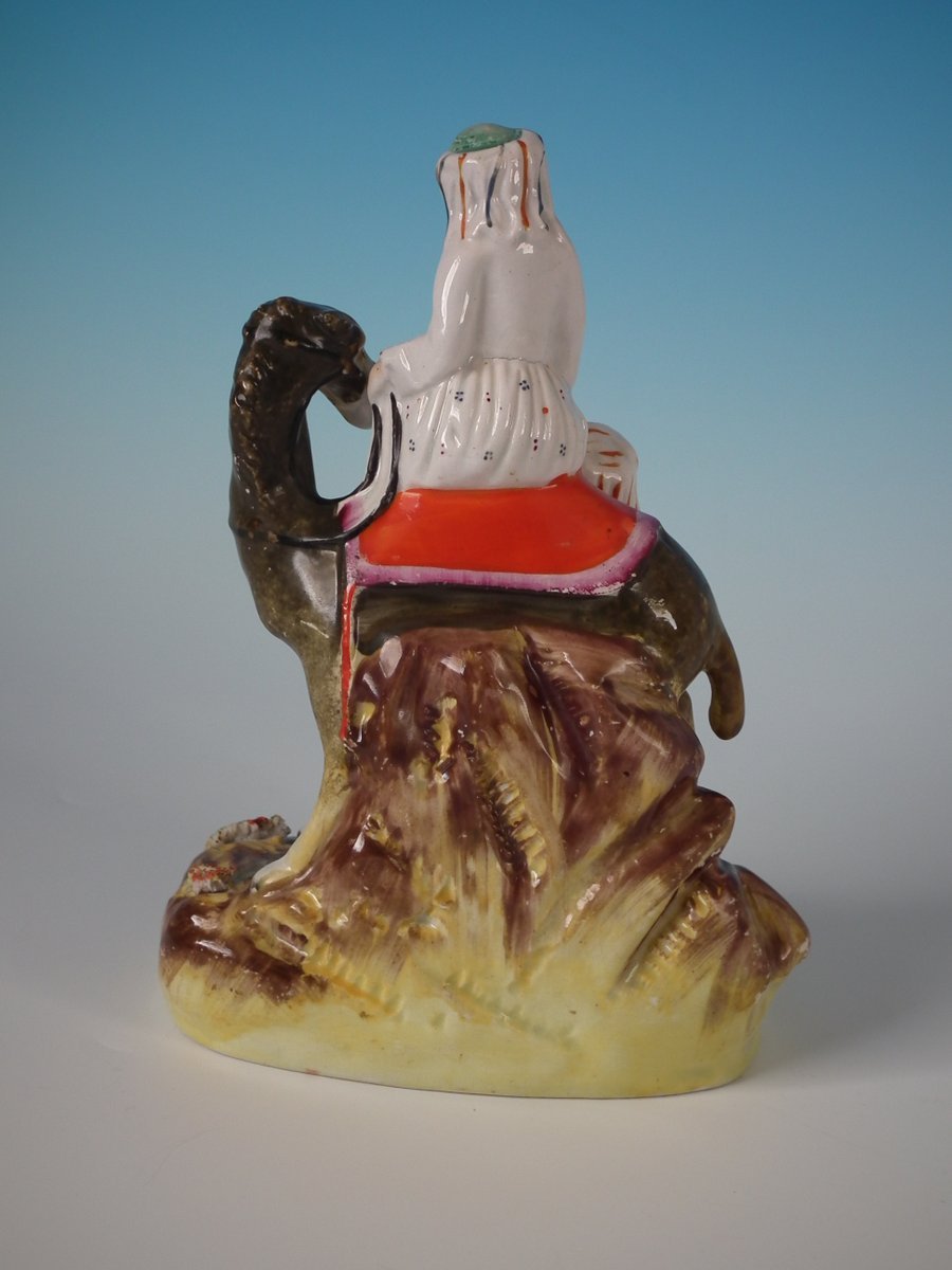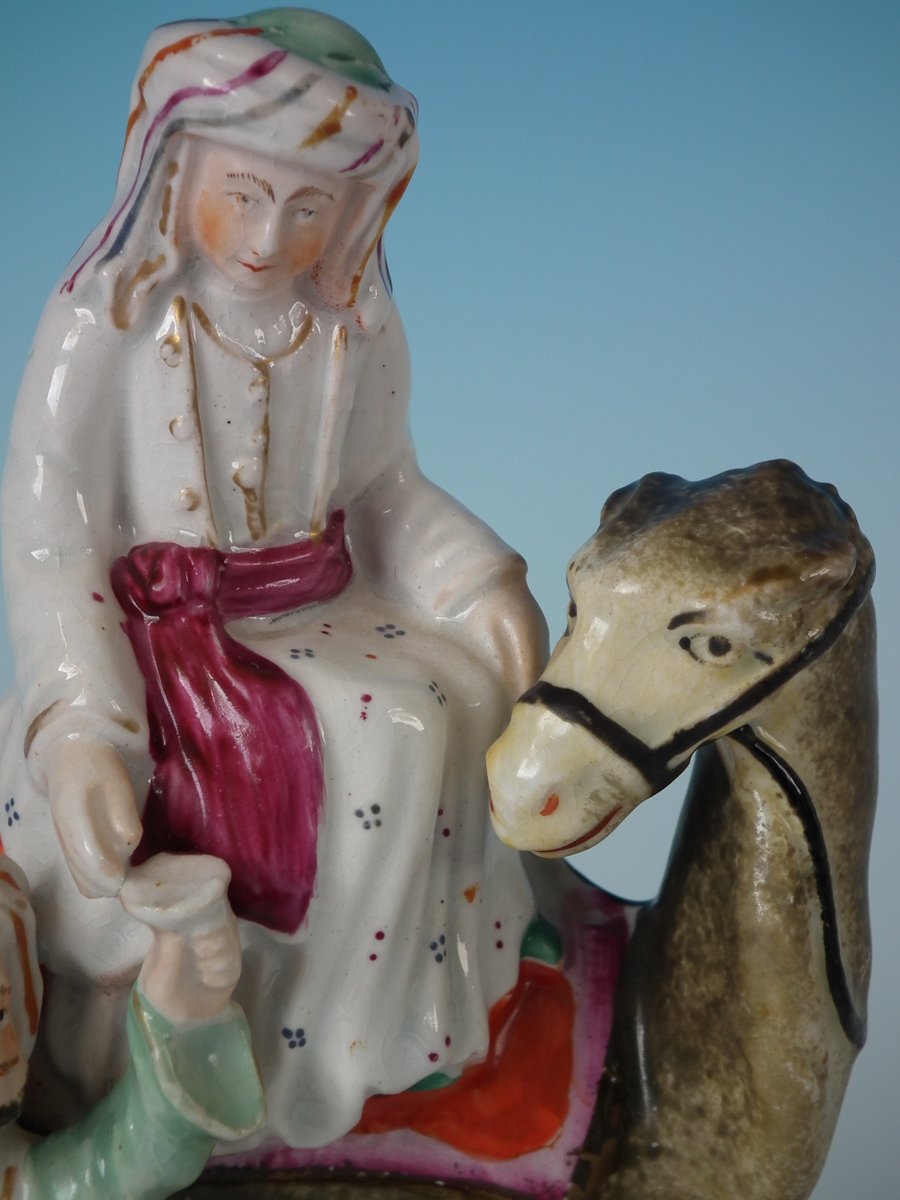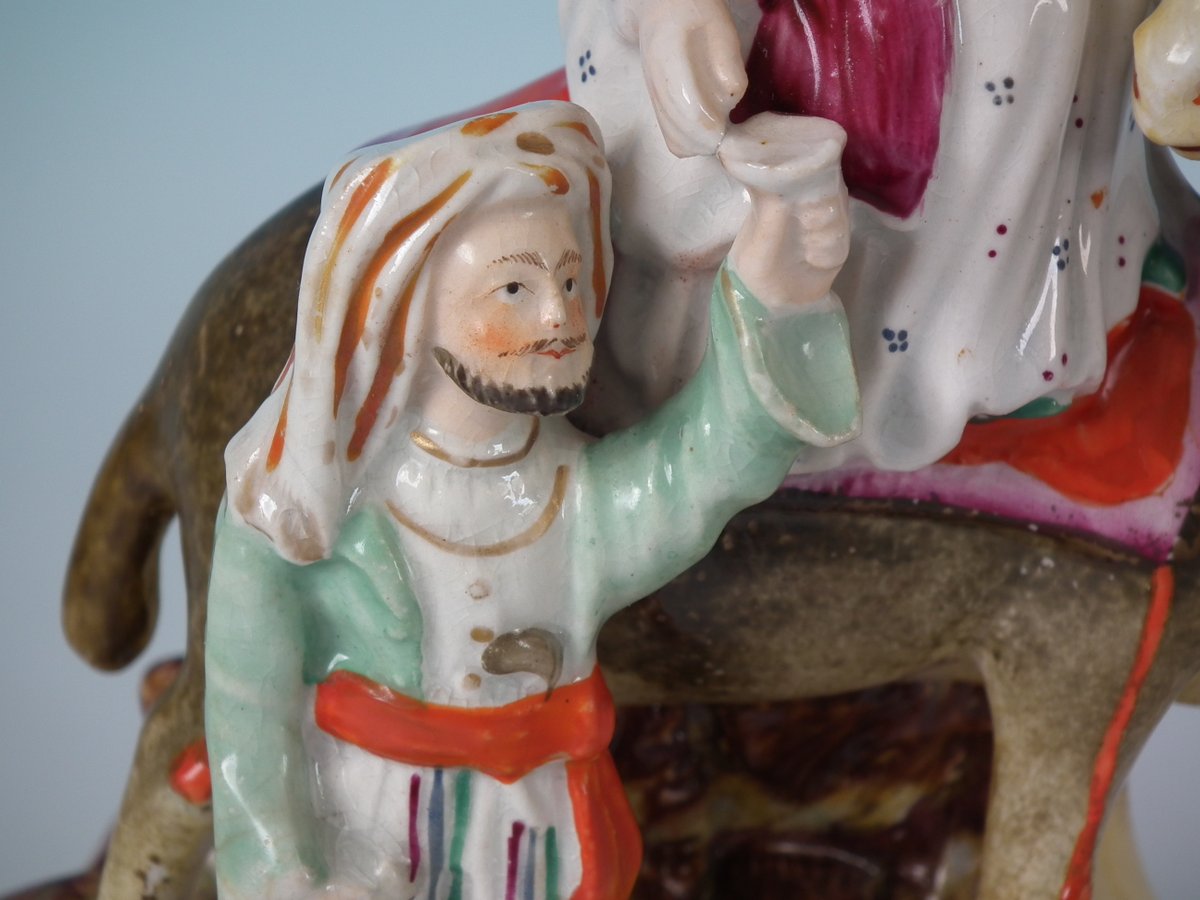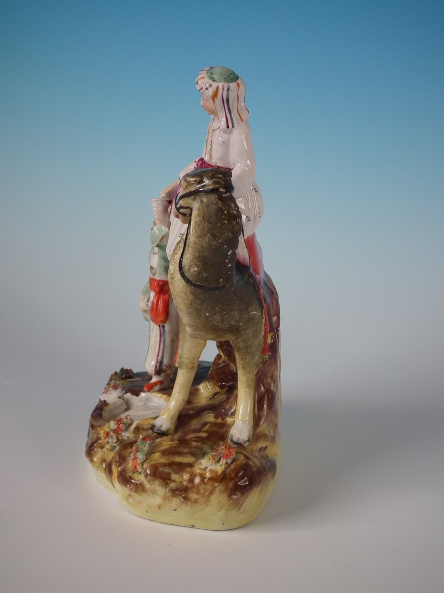 Victorian, circa 1860. 7.5ins high, 5.3ins wide, 3.7ins depth. Staffordshire Pottery figure which features Lady Hester Stanhope riding a camel with Dr Meryon