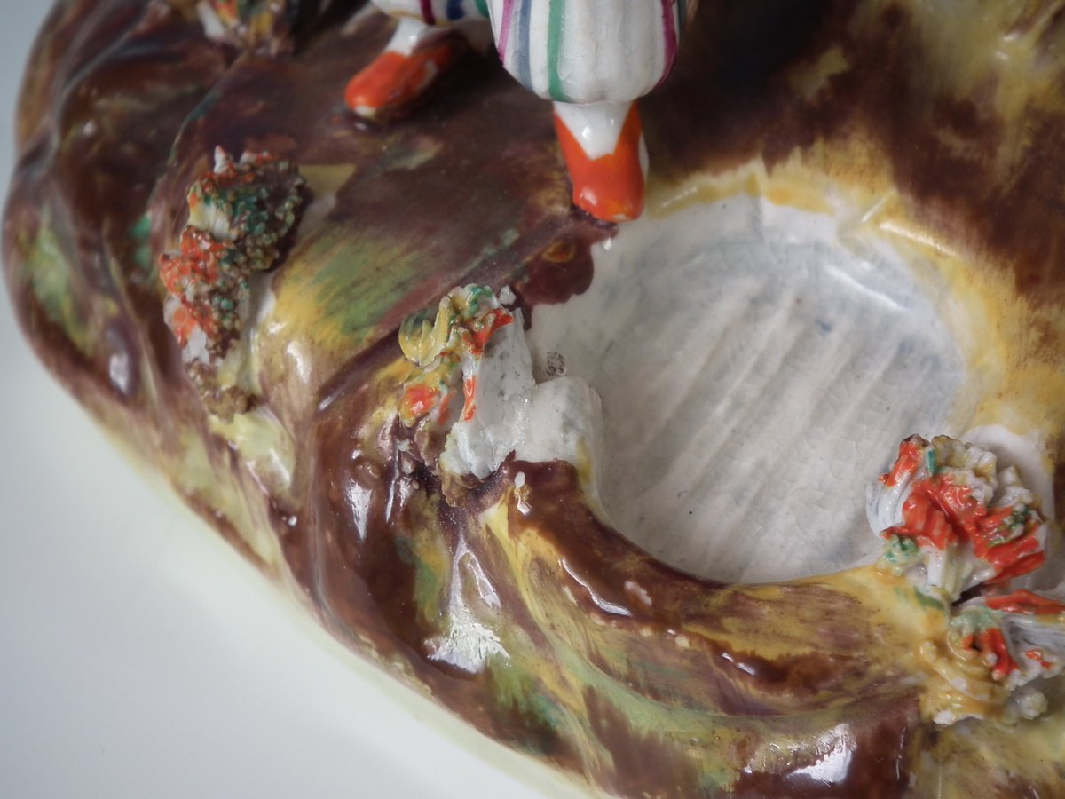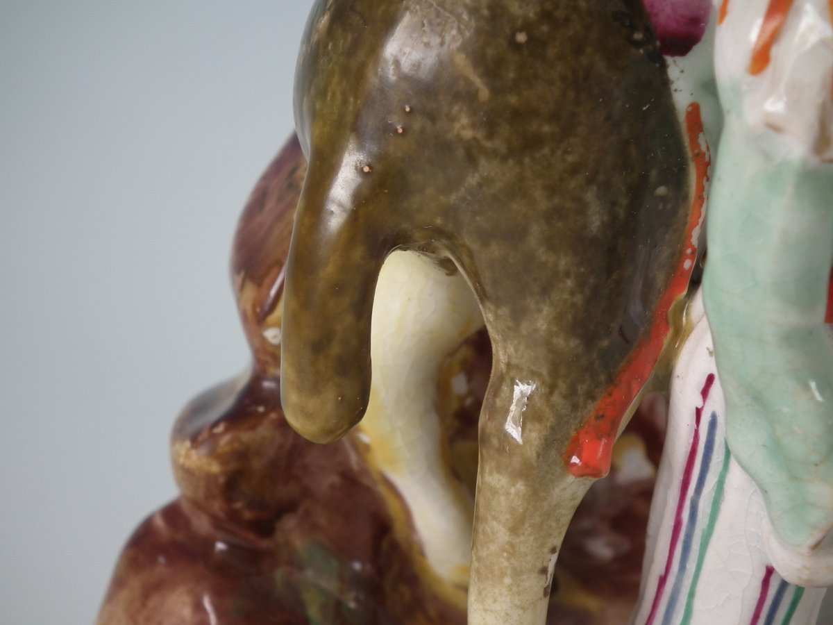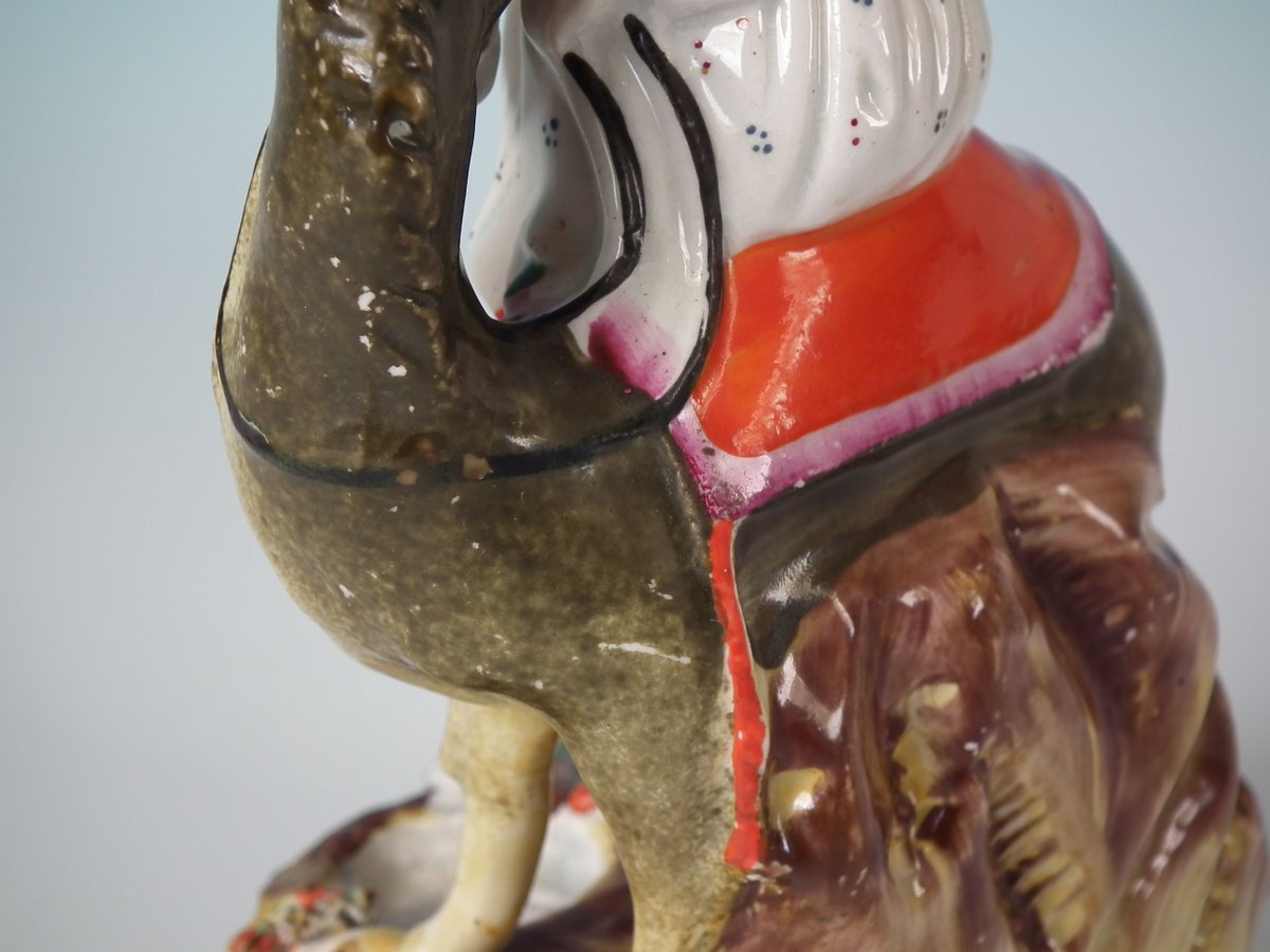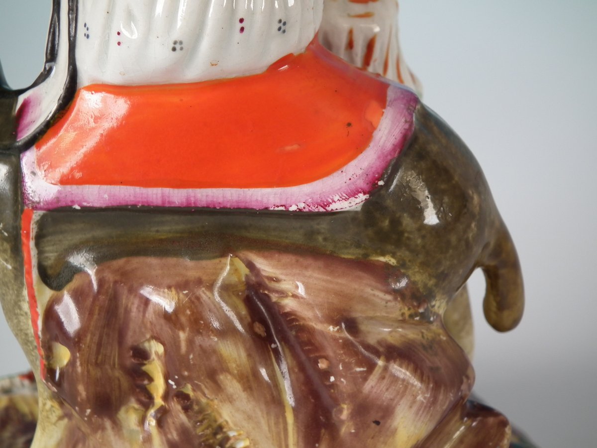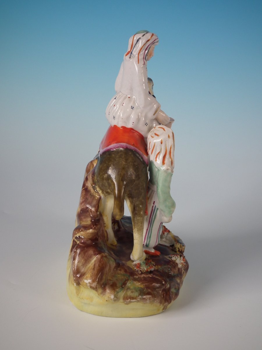 Victorian, circa 1860. 7.5ins high, 5.3ins wide, 3.7ins depth. Staffordshire Pottery figure which features Lady Hester Stanhope riding a camel with Dr Meryon