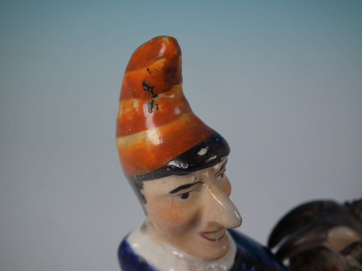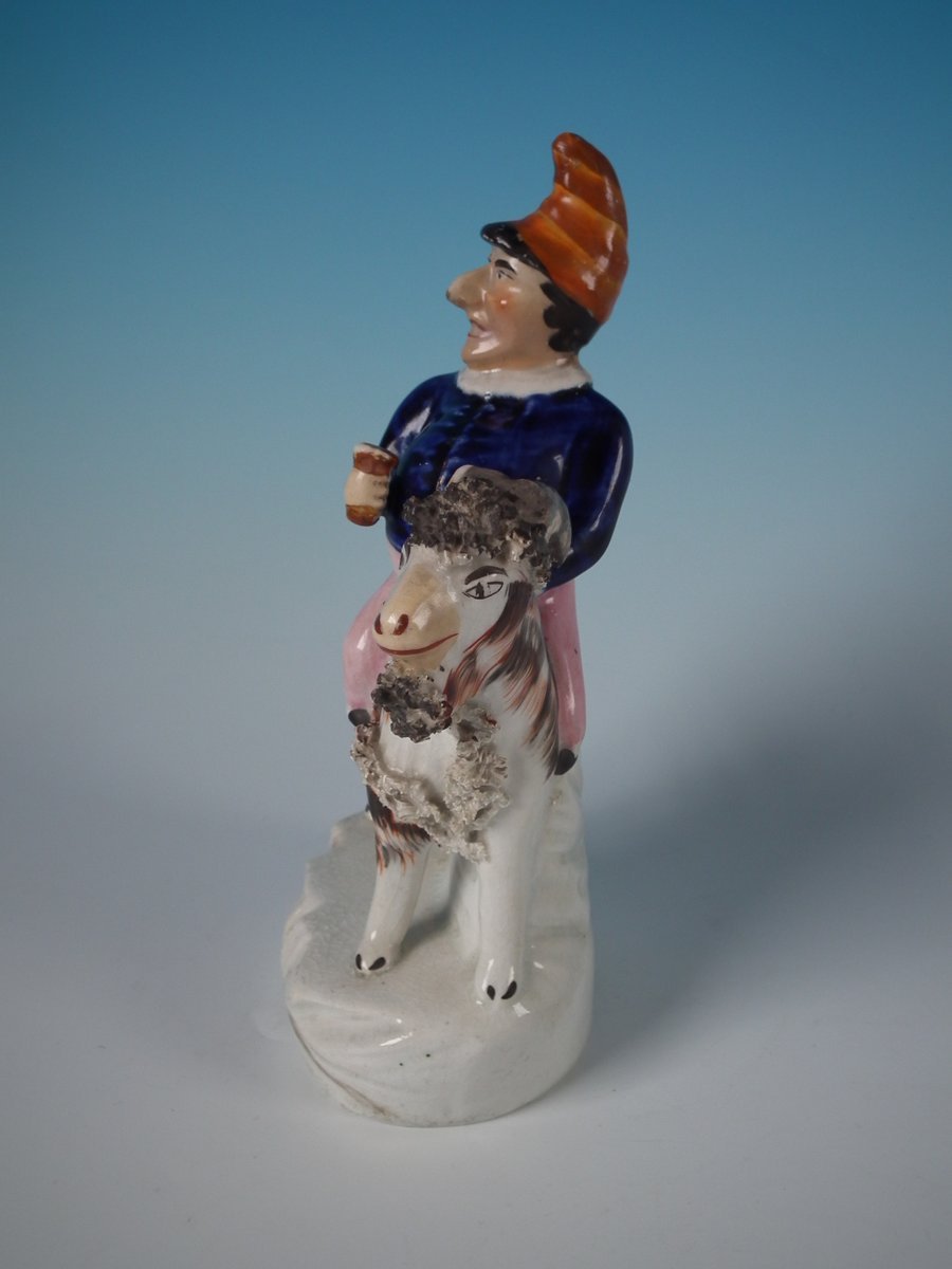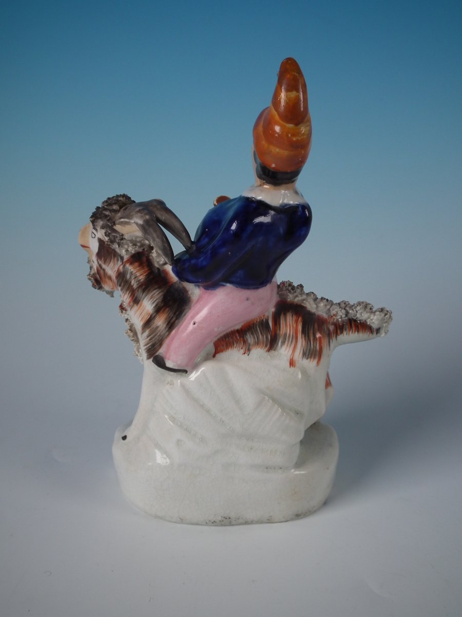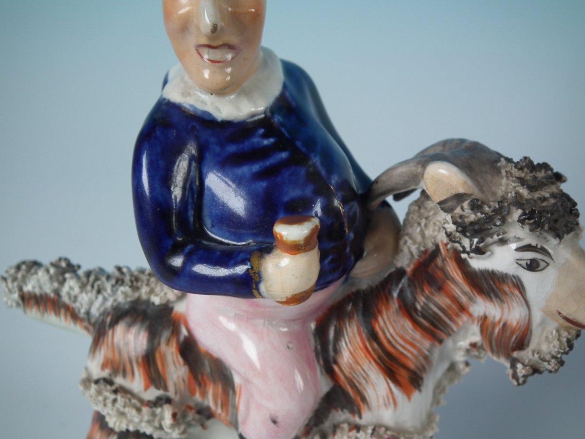 Staffordshire Pottery figure with a theatrical and literary theme which features punch riding a goat, stood on an oval base.