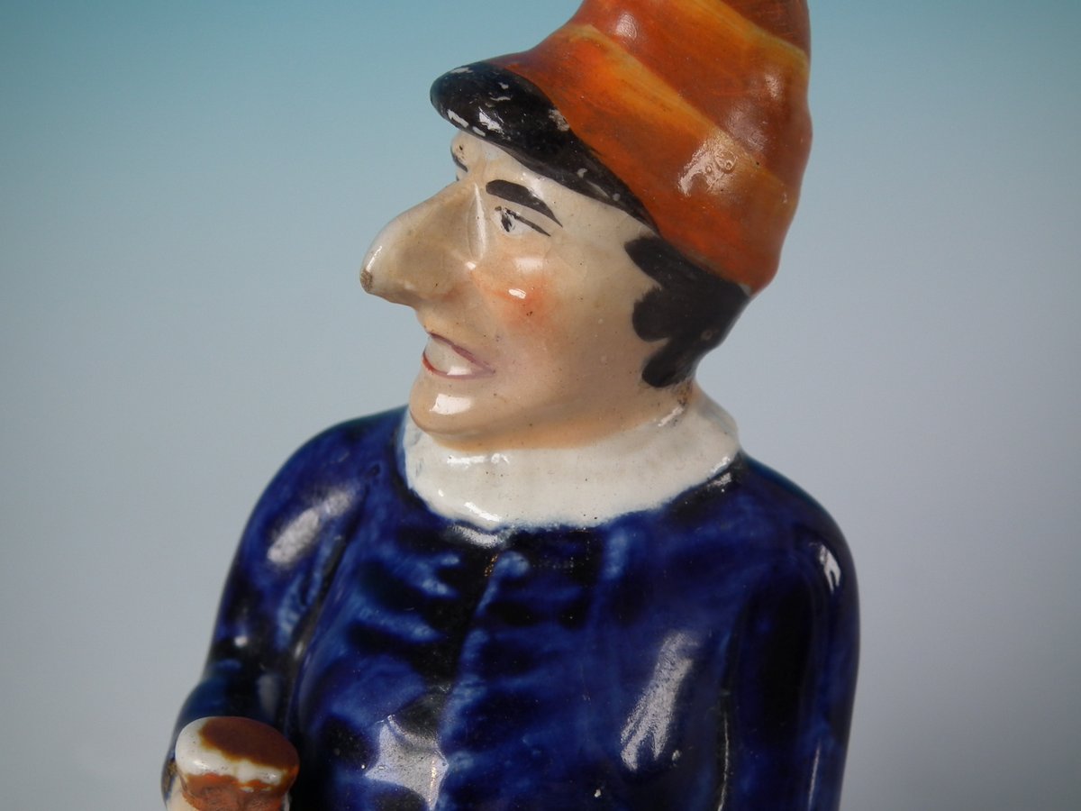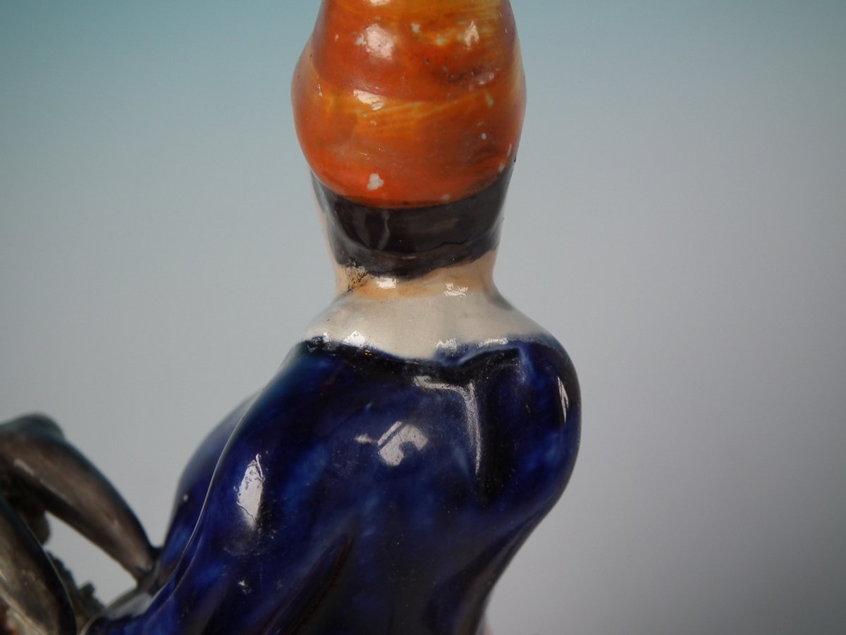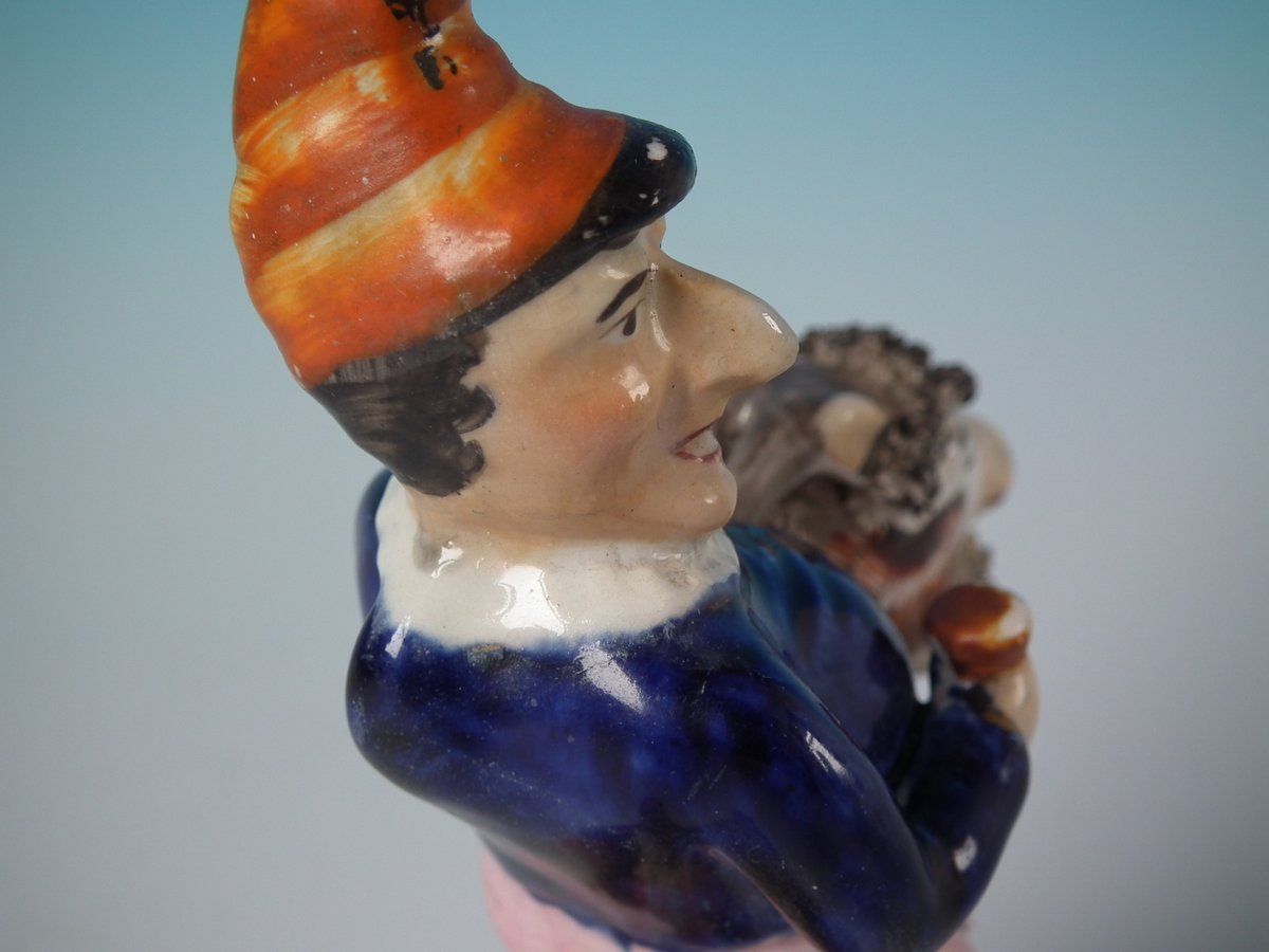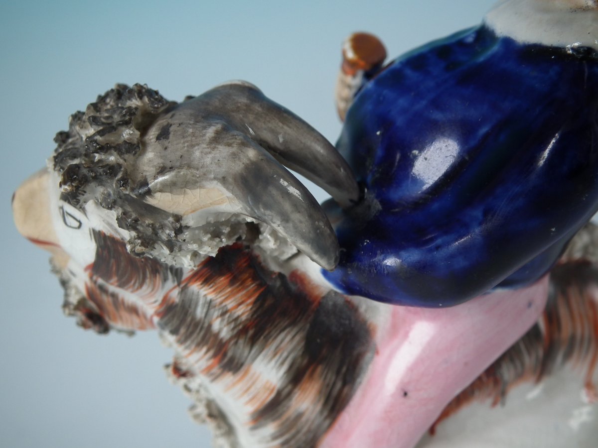 Staffordshire Pottery figure with a theatrical and literary theme which features punch riding a goat, stood on an oval base.
