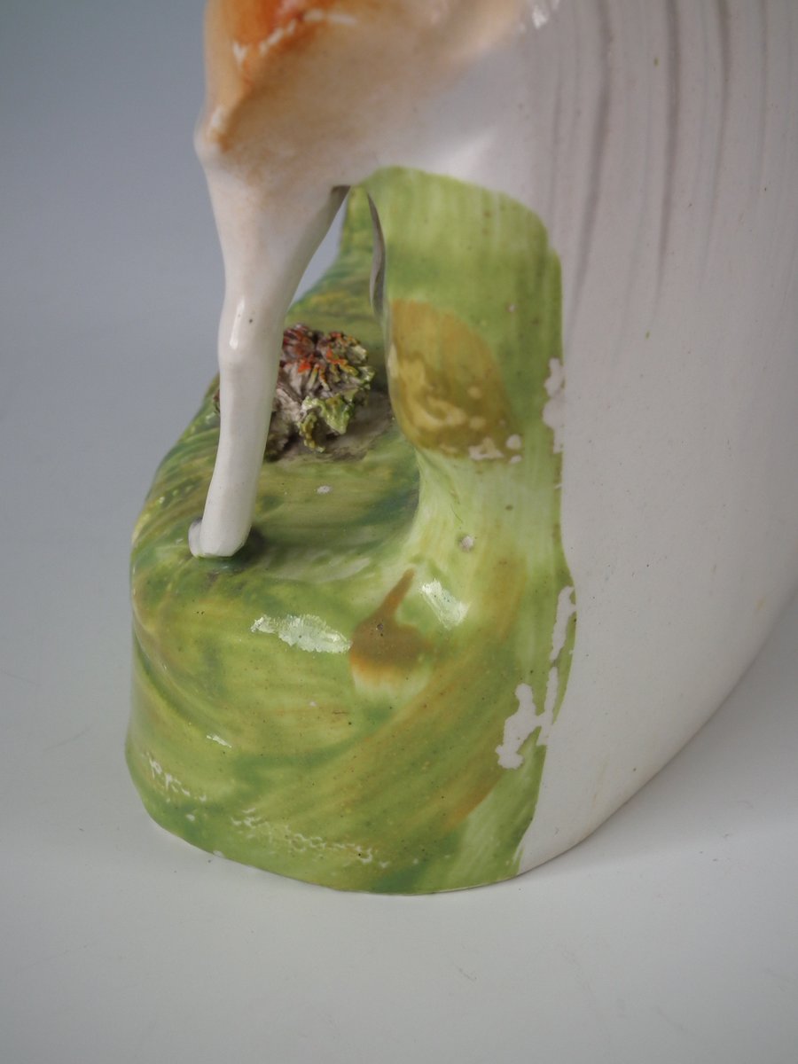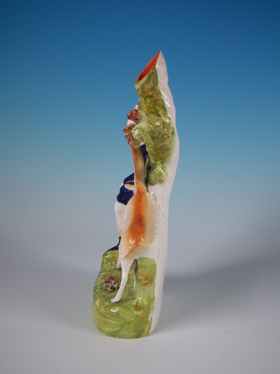 Victorian, circa 1860. 10ins high, 5.7ins wide, 2.8ins depth. Staffordshire Pottery spill vase which features a giraffe and its keeper, stood on a shaped base.