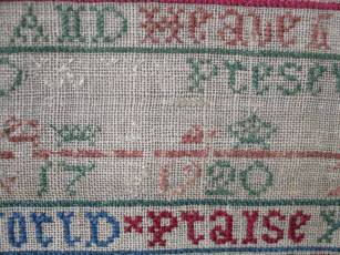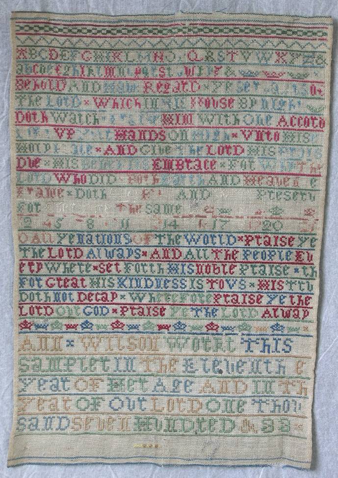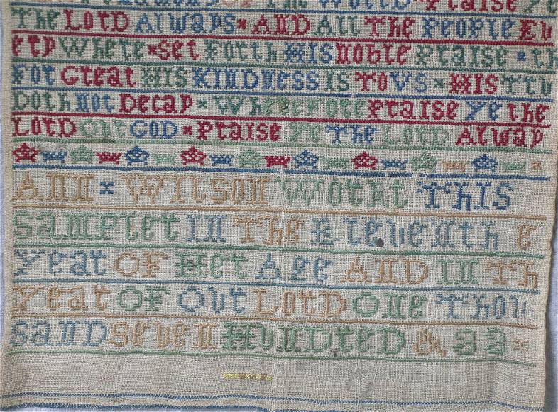 Signed and dated 'Ann Wilson Workt This Sampler in The Eleventh Year OF Her Age And in The Year OF Our Lord One Thousand Seven Hundred & 33'.