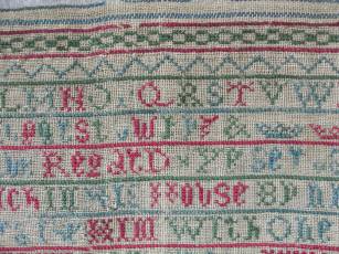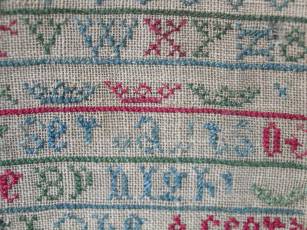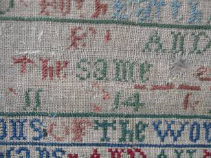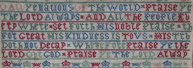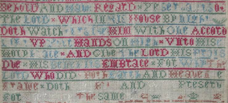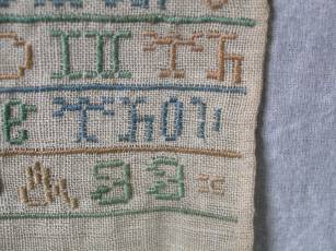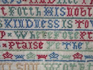 Stitch losses to letters of the alphabets, numbers, divider lines, verses and signature, illustrated.