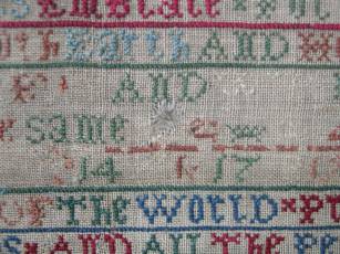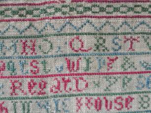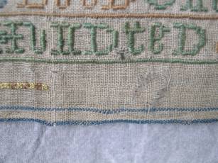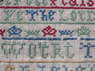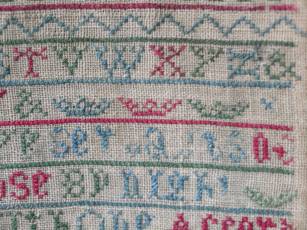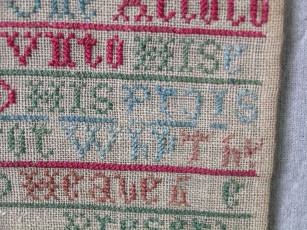 The sampler is worked in silk on linen ground, in a variety of stitches.