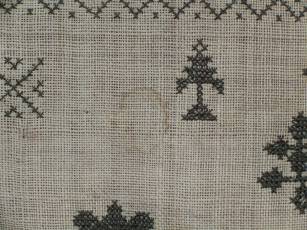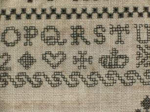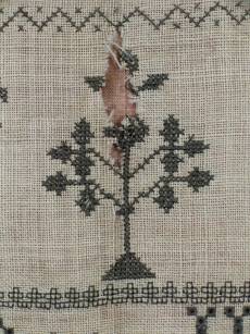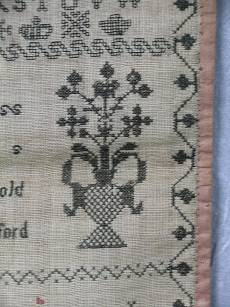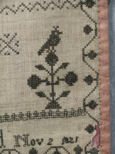 The sampler is worked in silk on canvas ground, in variety of stitches including Algerian eye.