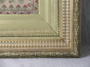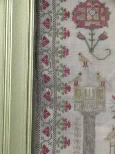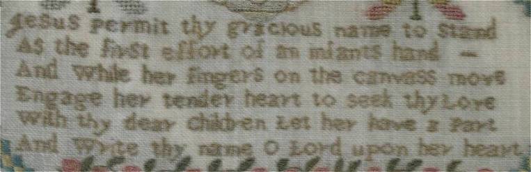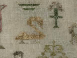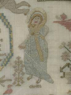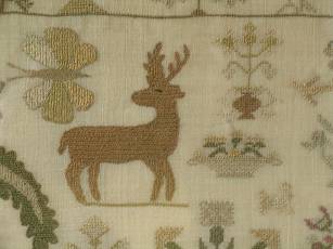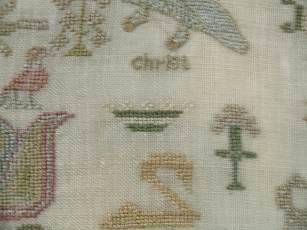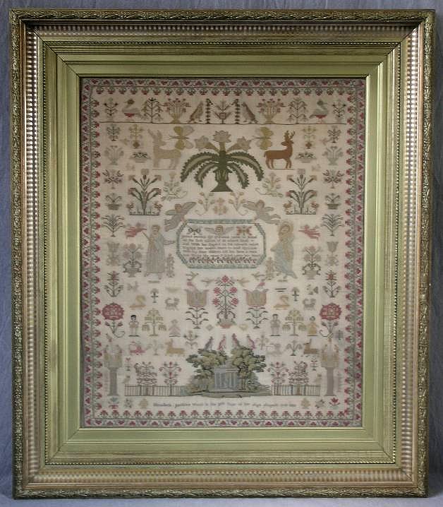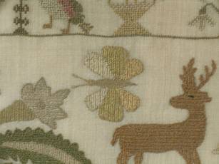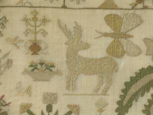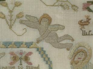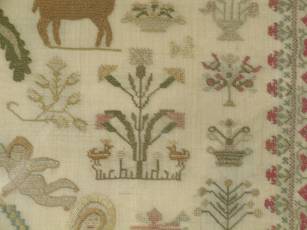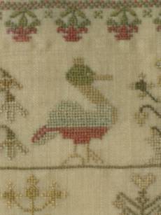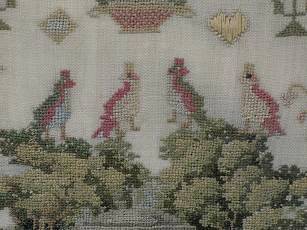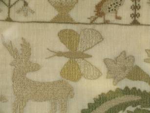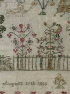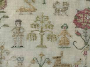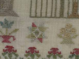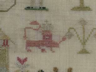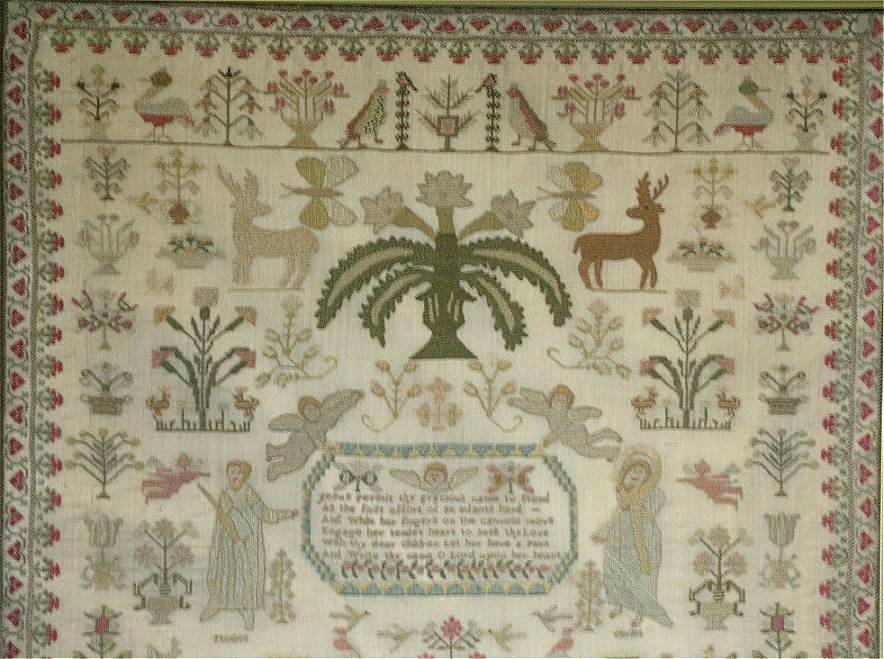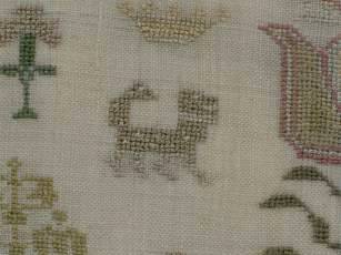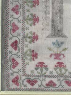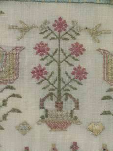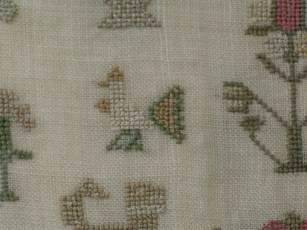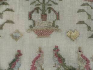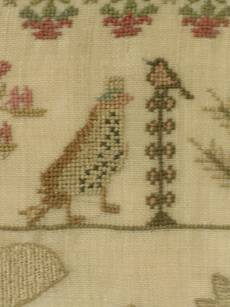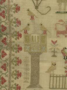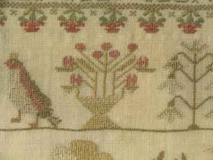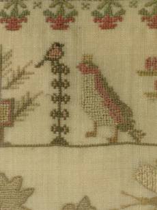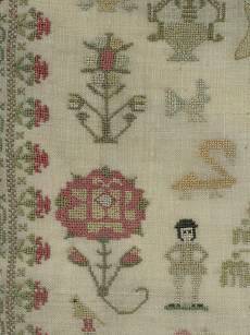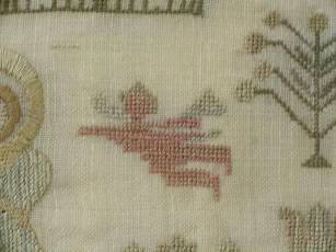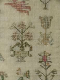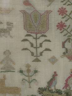 The sampler is worked in silk on fine linen ground, in a variety of stitches.