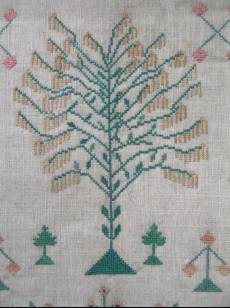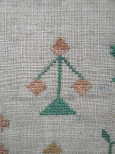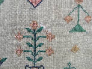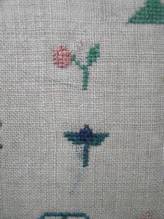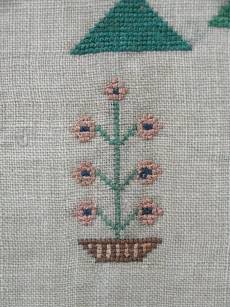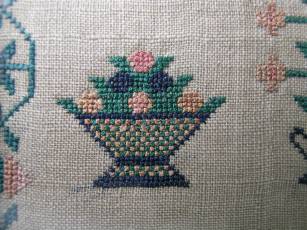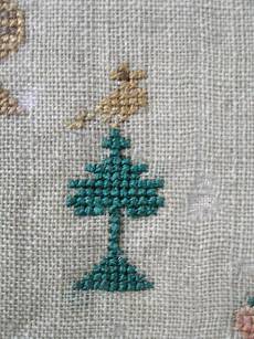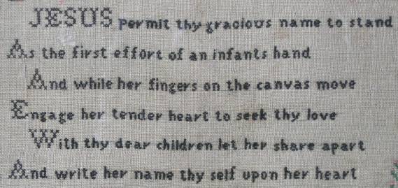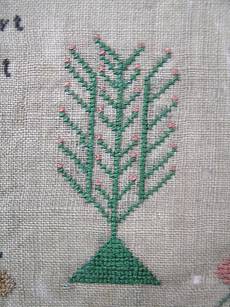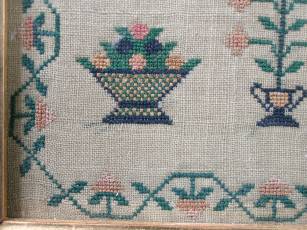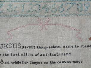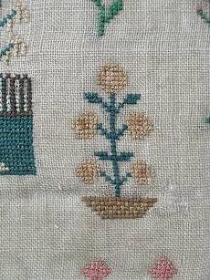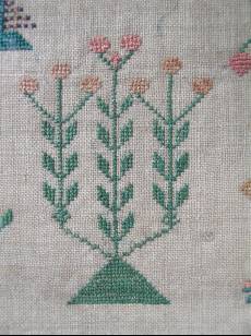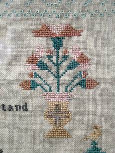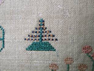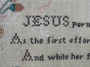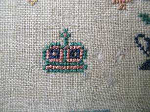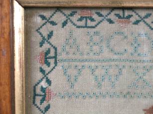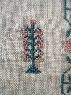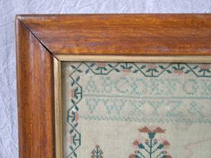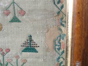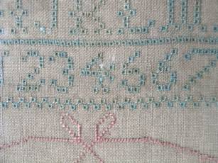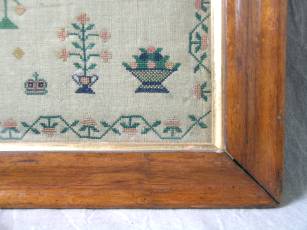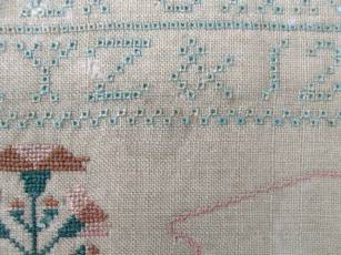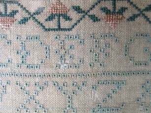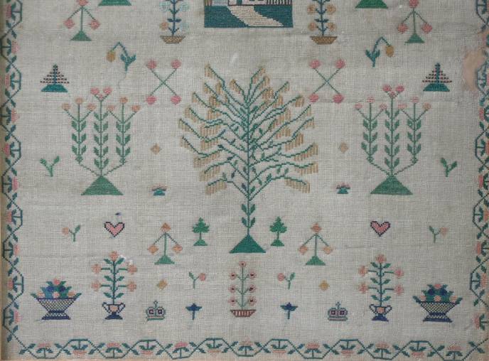 The sampler is worked in silk on linen ground, in cross stitch and Algerian eye.