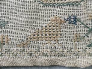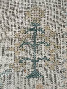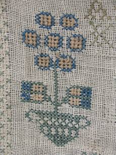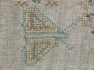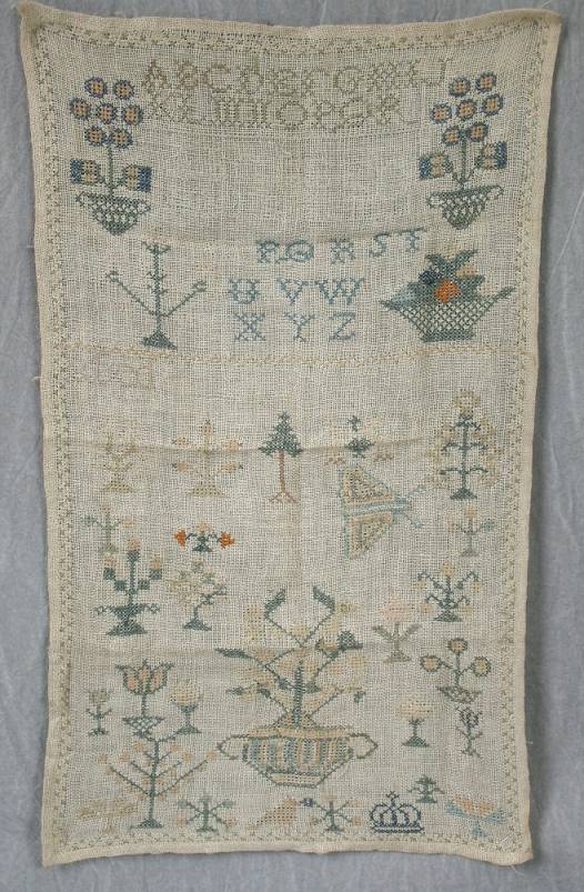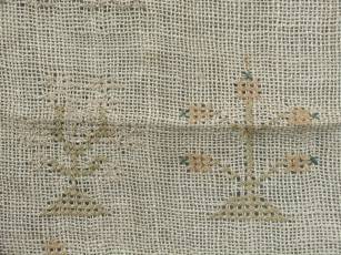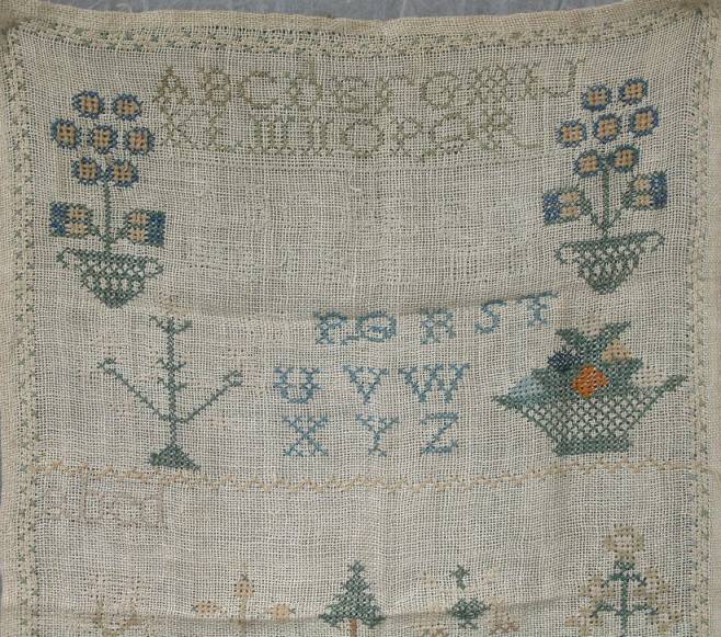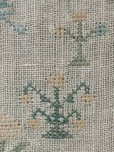 The sampler is worked in cotton on canvas ground, in cross stitch throughout.