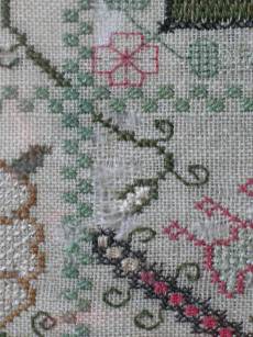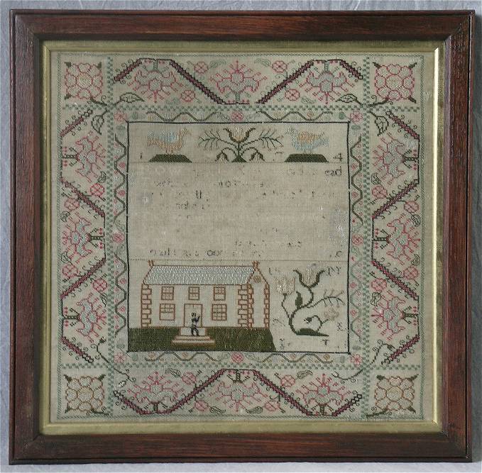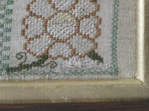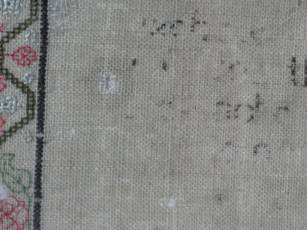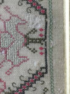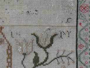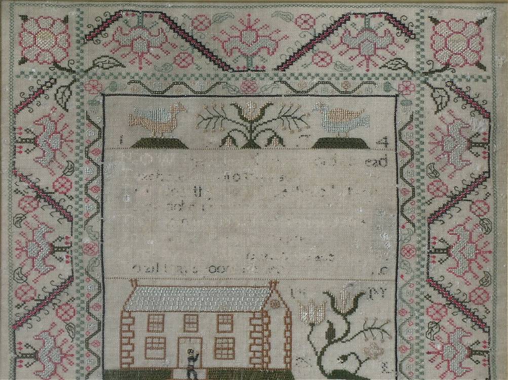 Stitch losses to holed areas of border, verse, date and family initials, worst illustrated.