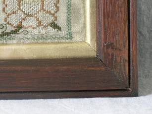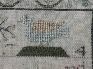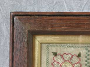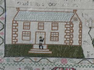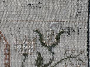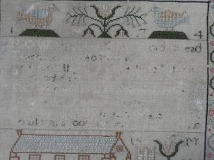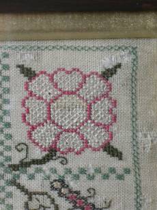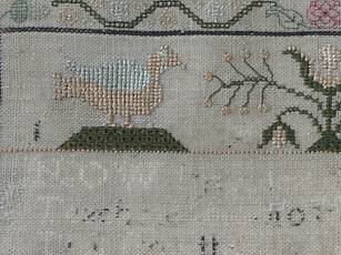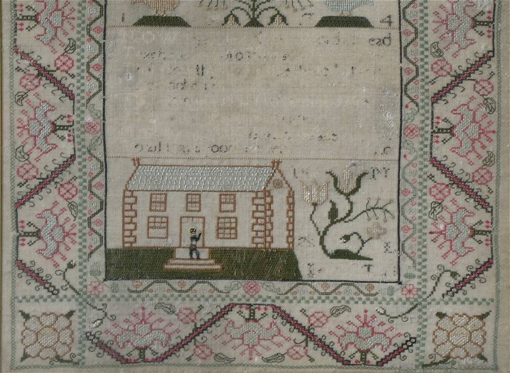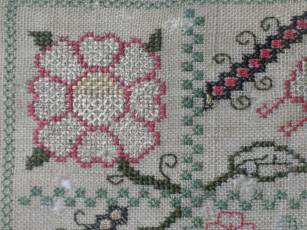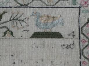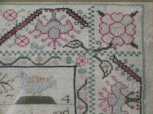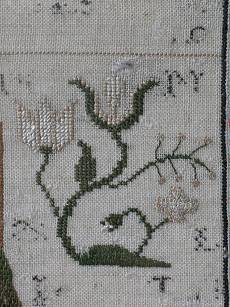 The sampler is worked in silk on linen ground, in a variety of stitches.