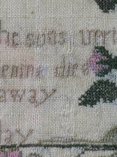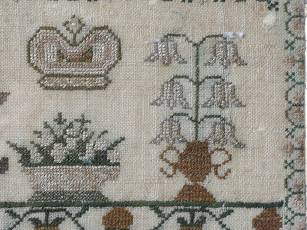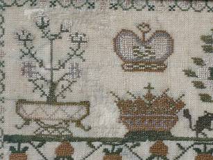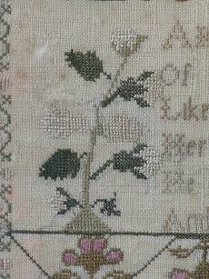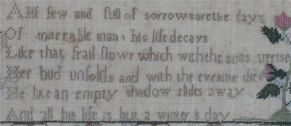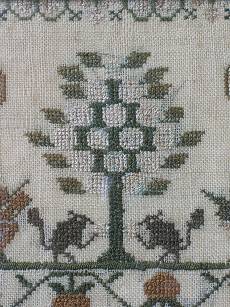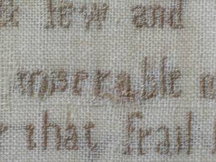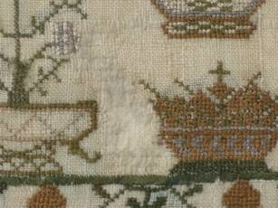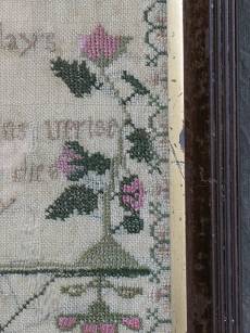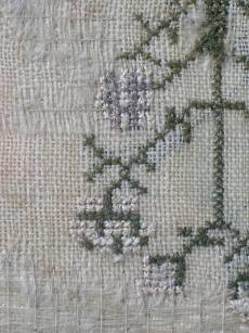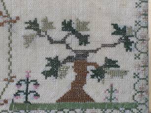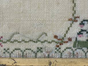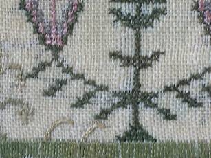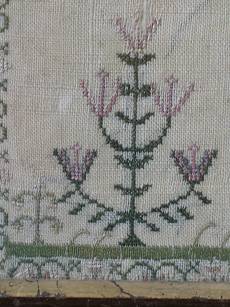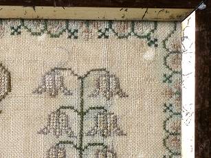 The sampler is worked in silk on linen ground, in a variety of stitches.