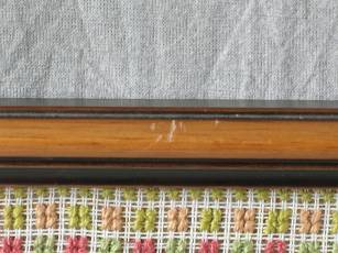 Minor stitch loss to orange thread in verse, and two corners of border, illustrated.
