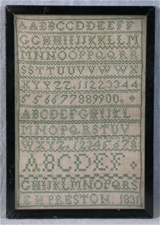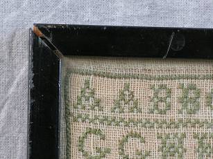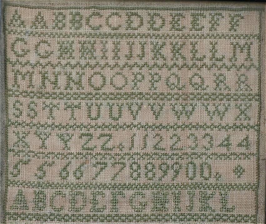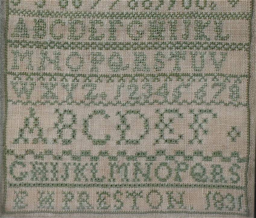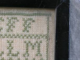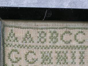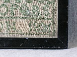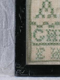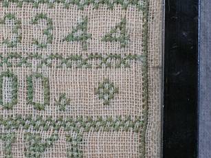 The sampler is worked in silk on linen ground, in a variety of stitches including Algerian eye.