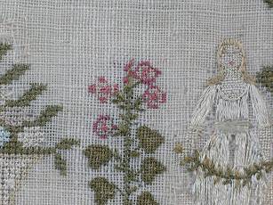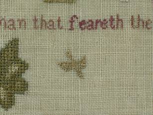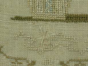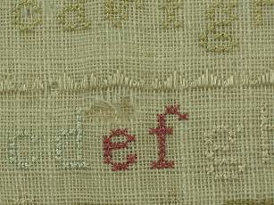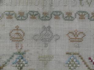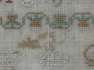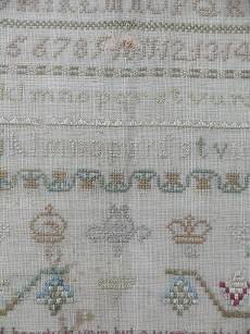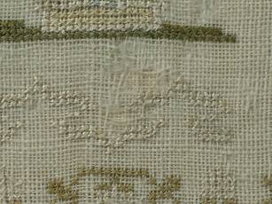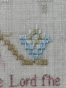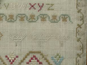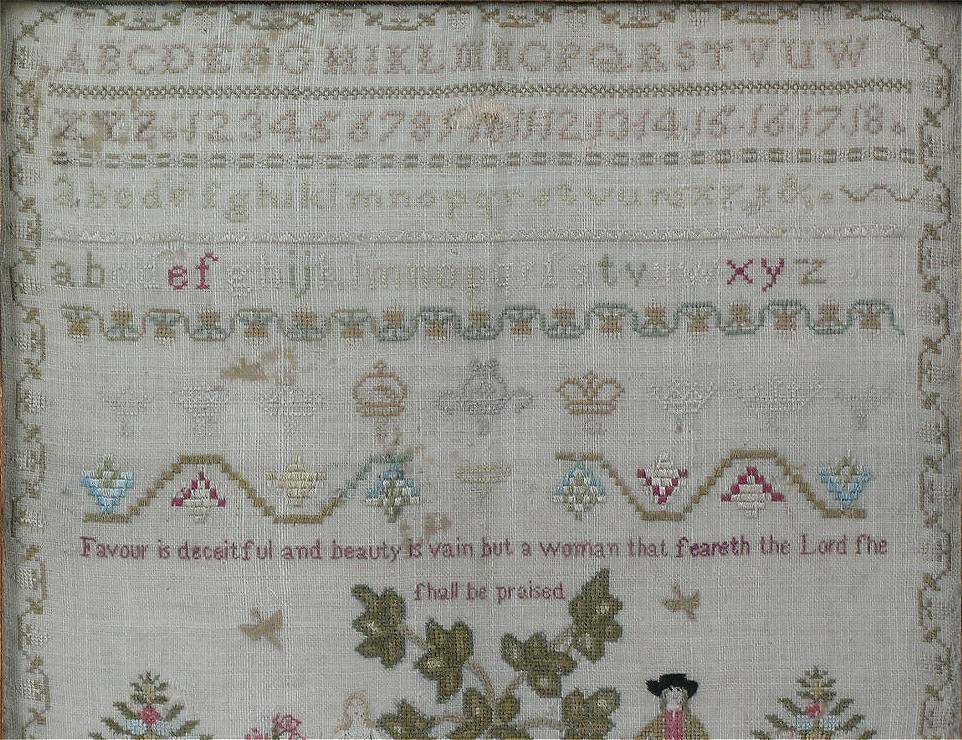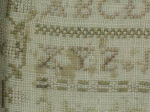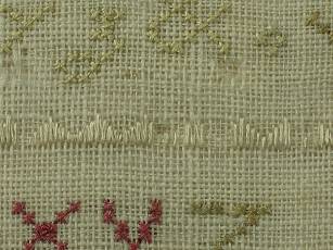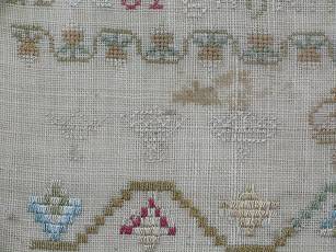 The sampler is worked in silk on linen ground, in a variety of stitches.