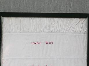 Entitled 'Useful Work' and worked in red cotton on linen ground.