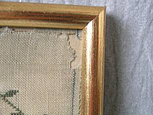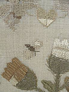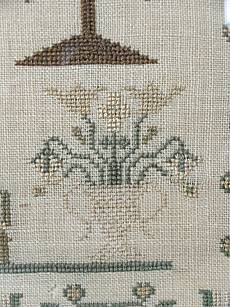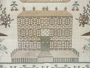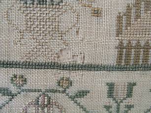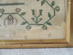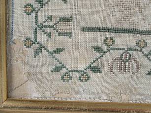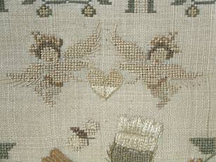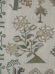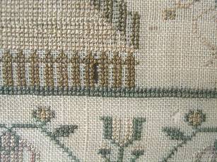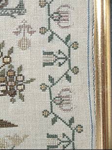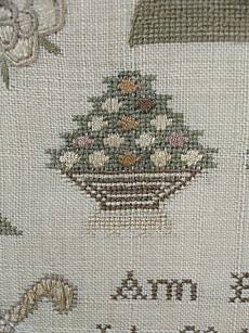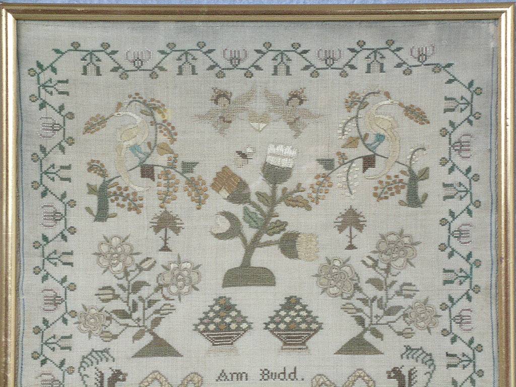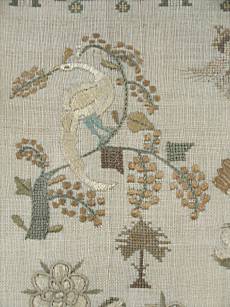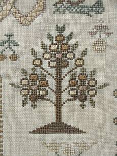 The sampler is worked in silk and cotton on linen ground, in a variety of stitches.