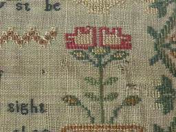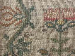 The sampler is worked in a silk-like thread on linen ground, in variety of stitches including Algerian eye.