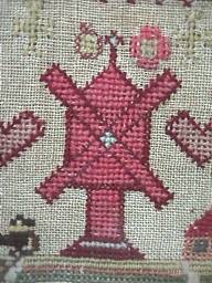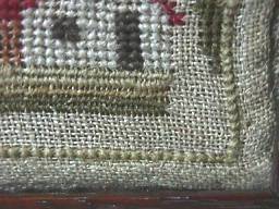 The sampler is worked in fine wool and silk on canvas ground, in a variety of stitches.