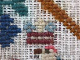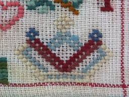 The sampler is worked in wool and cotton on linen ground, in a variety of stitches.
