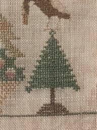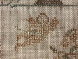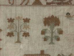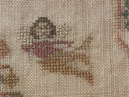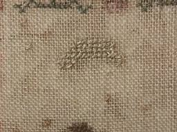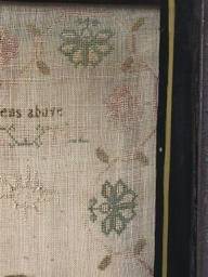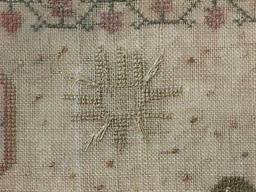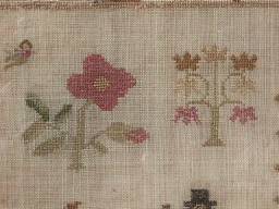 The sampler is worked in silk on linen ground, in a variety of stitches.