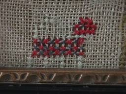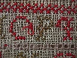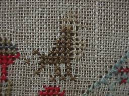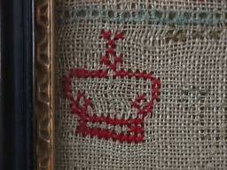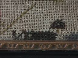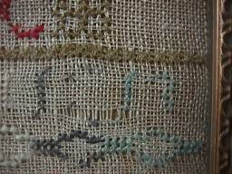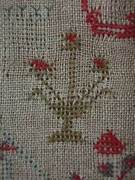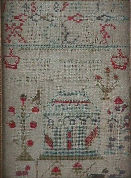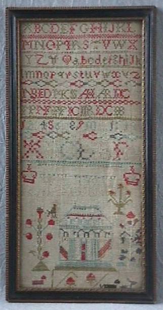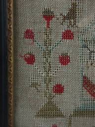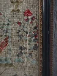 The sampler is worked in wool and silk on canvas ground, in cross stitch and Algerian eye.