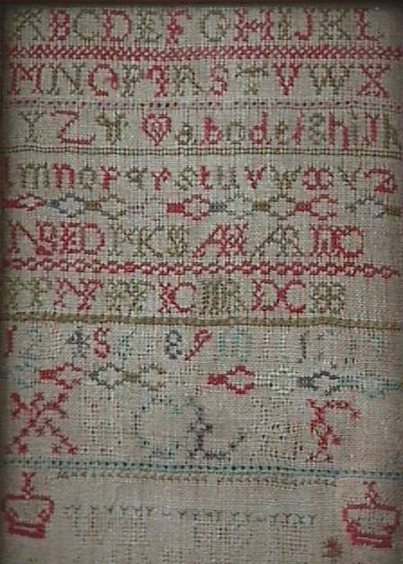 Some stitch losses to the family initials, letters of the alphabet, divider lines and motifs, illustrated.