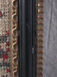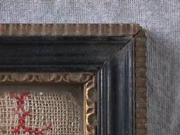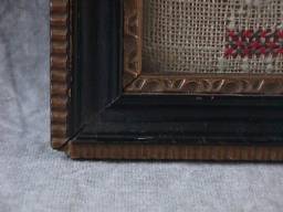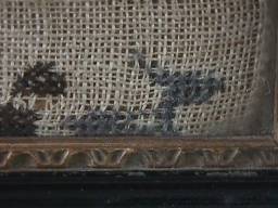 Victorian, circa 1840. 16.5ins high by 8ins. Framed in an old gilt and wood frame with rippled, old glass. Stitched over card with chip board and brown paper dust cover.