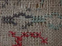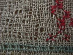 CONDITION: Good. No holes, but some pulling of the ground, illustrated.
