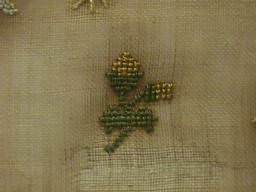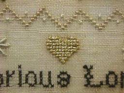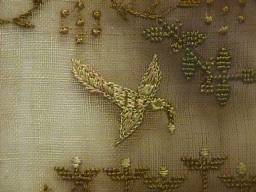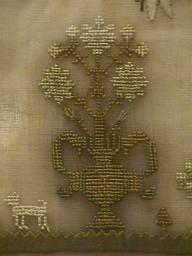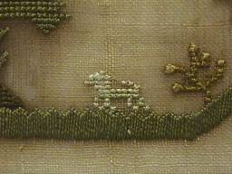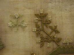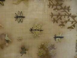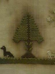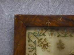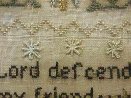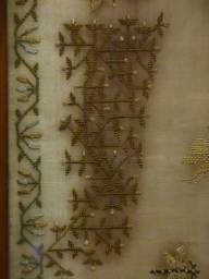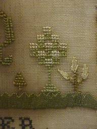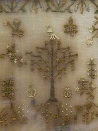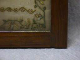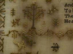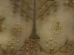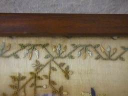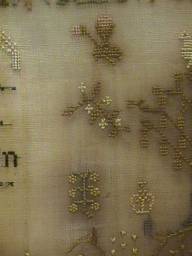 The sampler is worked in fine silk on linen ground, in a variety of stitches.