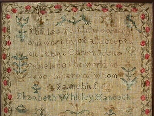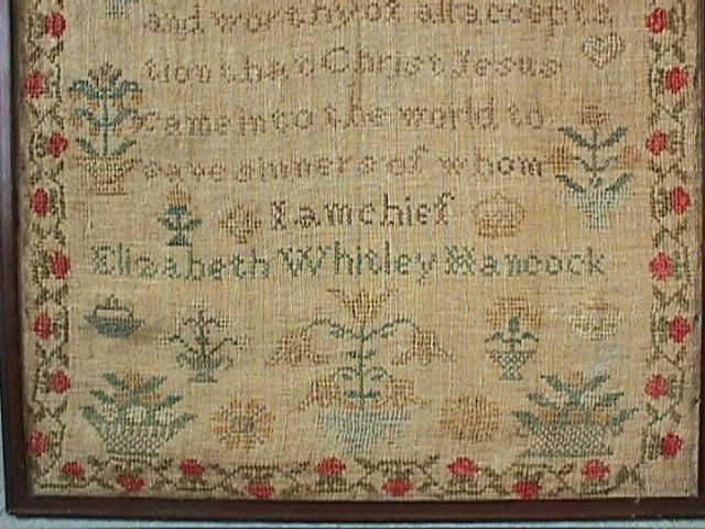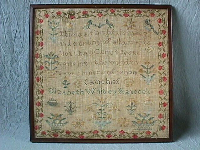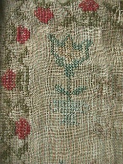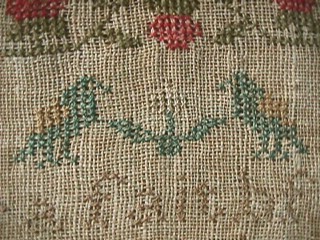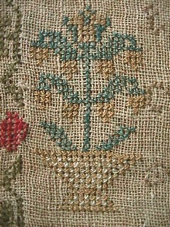 The sampler is worked in silk and in cross stitch throughout on a linen ground. Colours blue, red, green, gold and beige. A good set of motifs including potted flowering plants, fruit baskets,